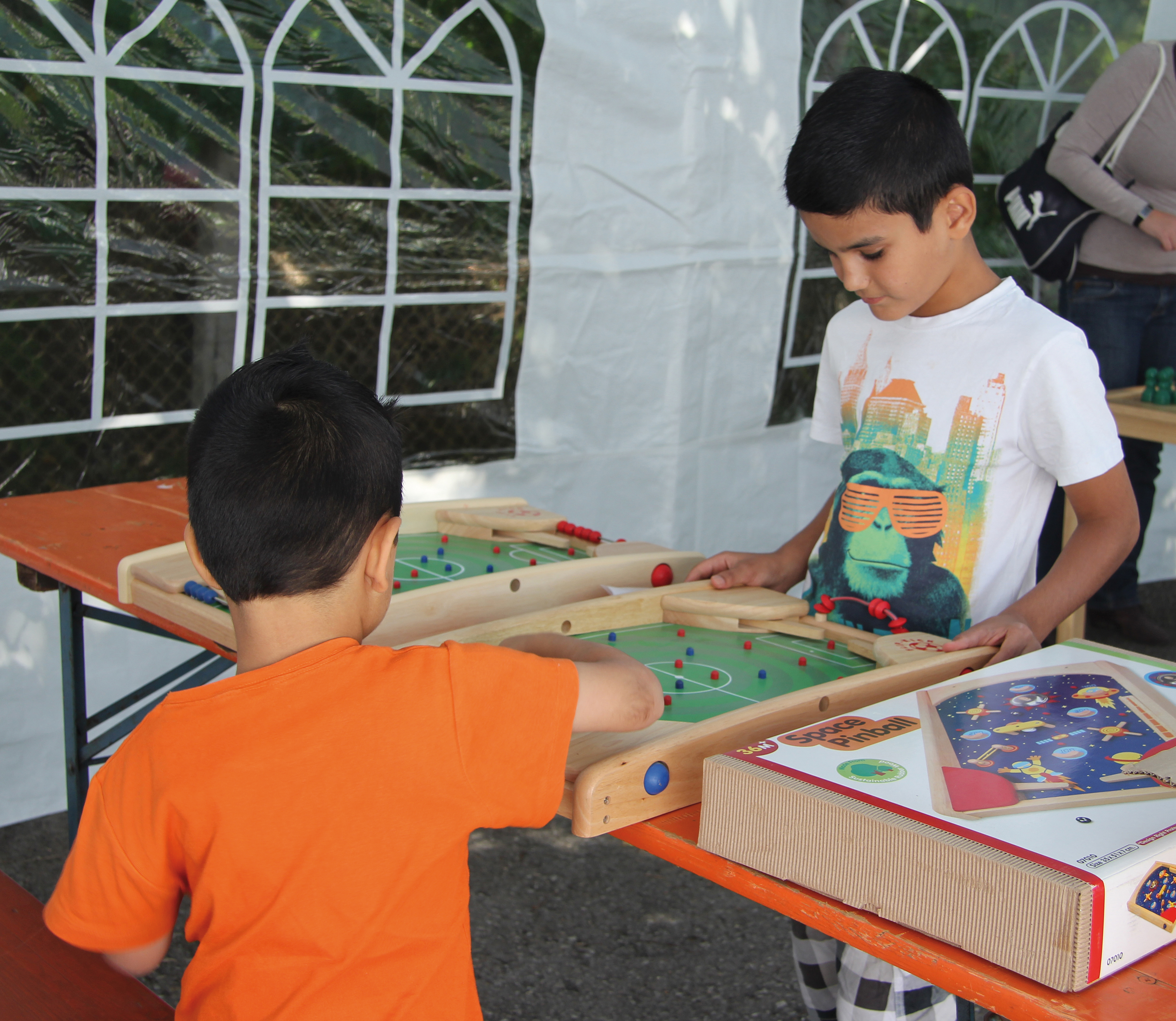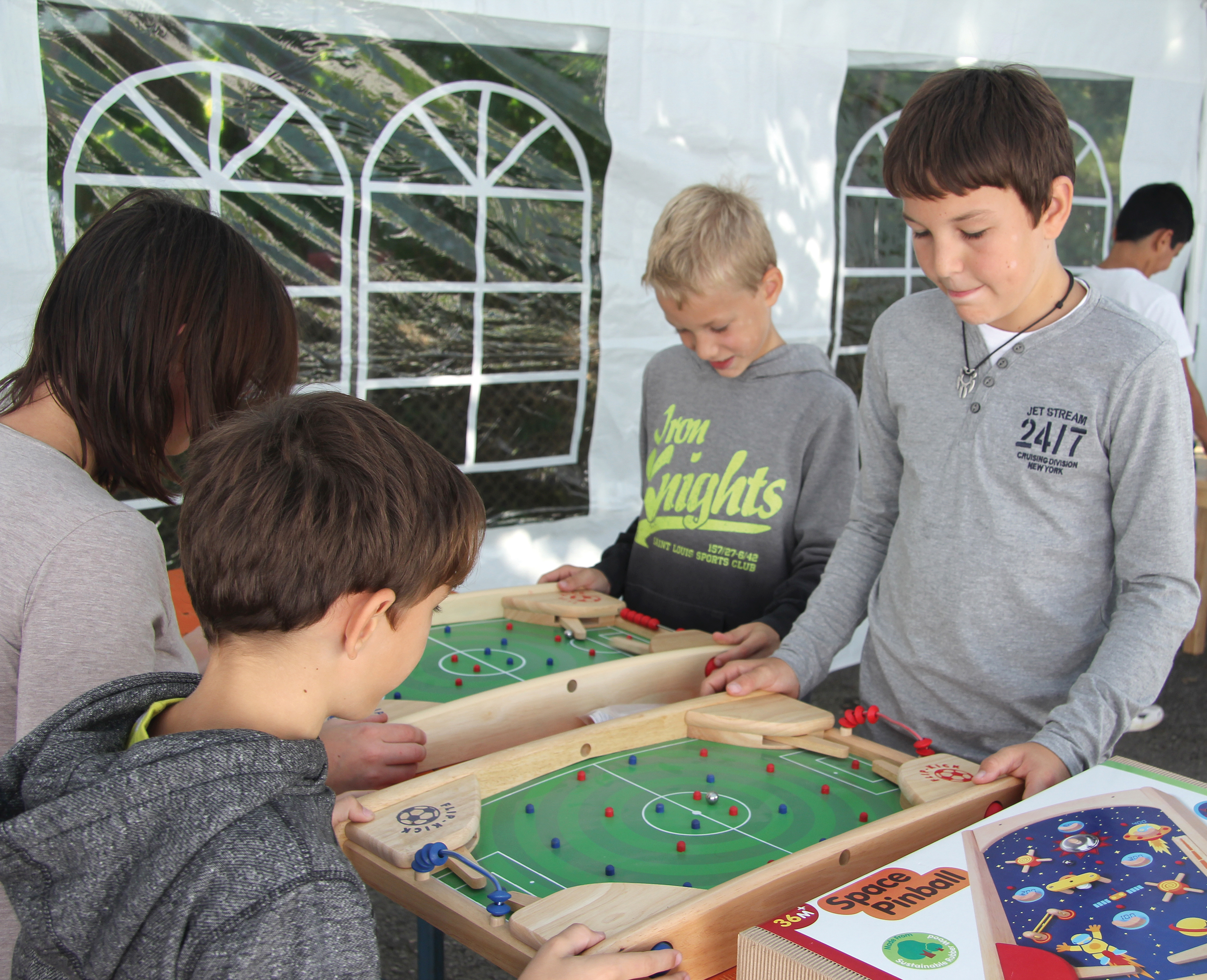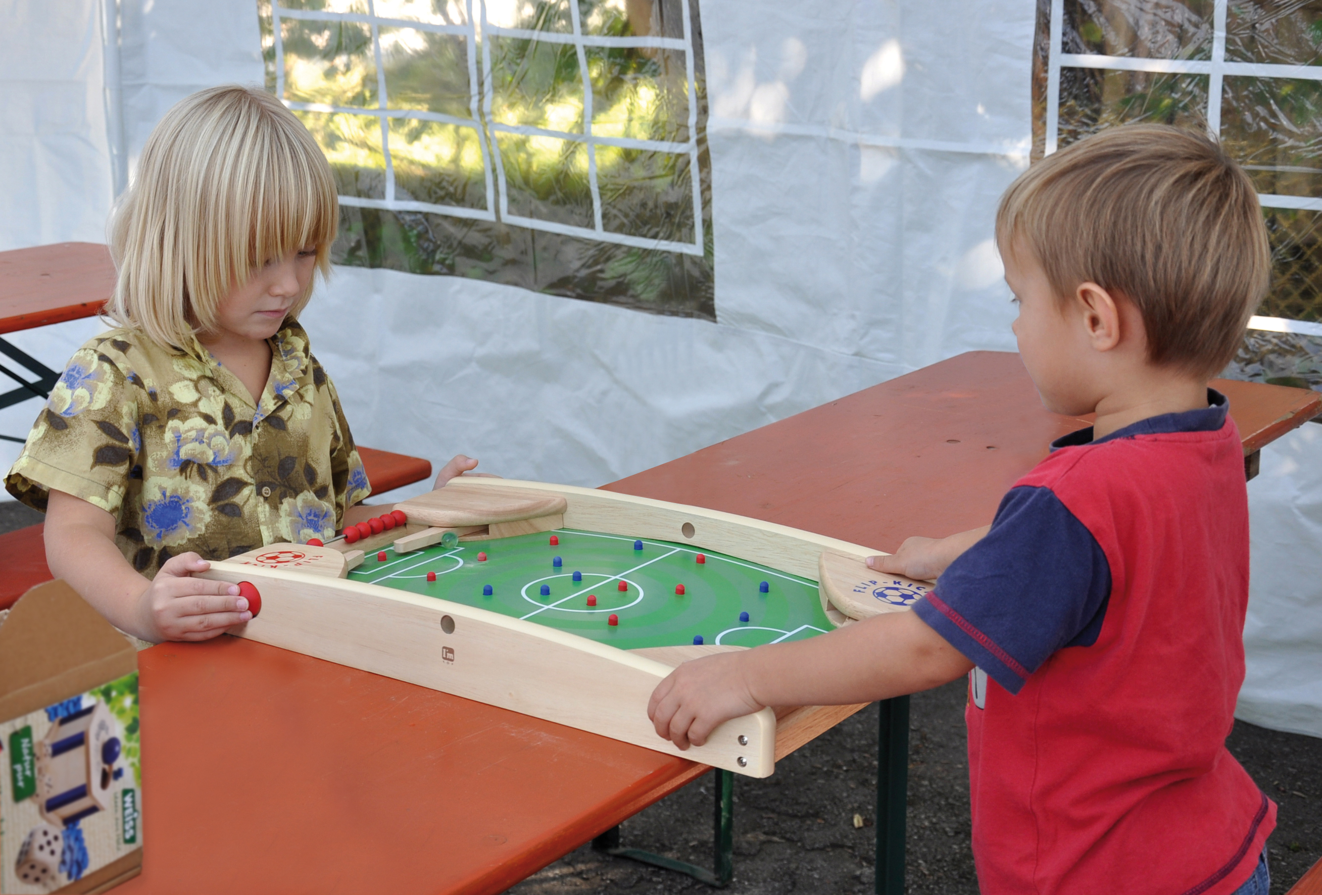 Ein toller Fußballspaß für zwei Ballkünstler. Eine Mischung aus Flipper und Kicker. Die Spielfläche ist so gewölbt, dass die Kugel zu einem der beiden Tore rollt. Das Spiel beginnt mit dem Einwurf der Metallkugel durch die Startlöcher in den seitlichen Rahmenteilen. Dann schießen die Spieler die Kugel mit den Flipper-Schenkeln in Richtung gegnerisches Tor. Auf jeder Seite werden die erzielten Tore mittels Holzperlen dargestellt. Schon kleine Kinder im Alter von 3 bis 4 Jahren erlernen die richtige Technik sehr schnell. Das Spiel macht aber Jugendlichen und Erwachsenen genauso viel Spass. Je nach Können der Akteure wird es sehr flott. Es fördert bei den Kindern Koordination und Reaktion. Die Technik ist ausgereift und sehr robust, Verschleißteile sind nicht vorhanden. Somit ist Spielspaß über viele Jahre garantiert.