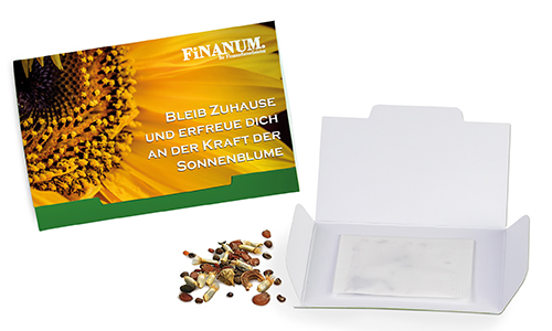 Der ideale Werbebotschafter für das ganze Jahr eignet sich perfekt als Mailingbegleiter. Die Karte kann mitverschiedenen, zur Auswahl stehenden Samen befüllt werden. Die Verpackung in flacher Kartenform wird rundum gestaltet und bedruckt und ist durch die flache Form ein ideales Mailing-Produkt und sympathisches Giveaway.