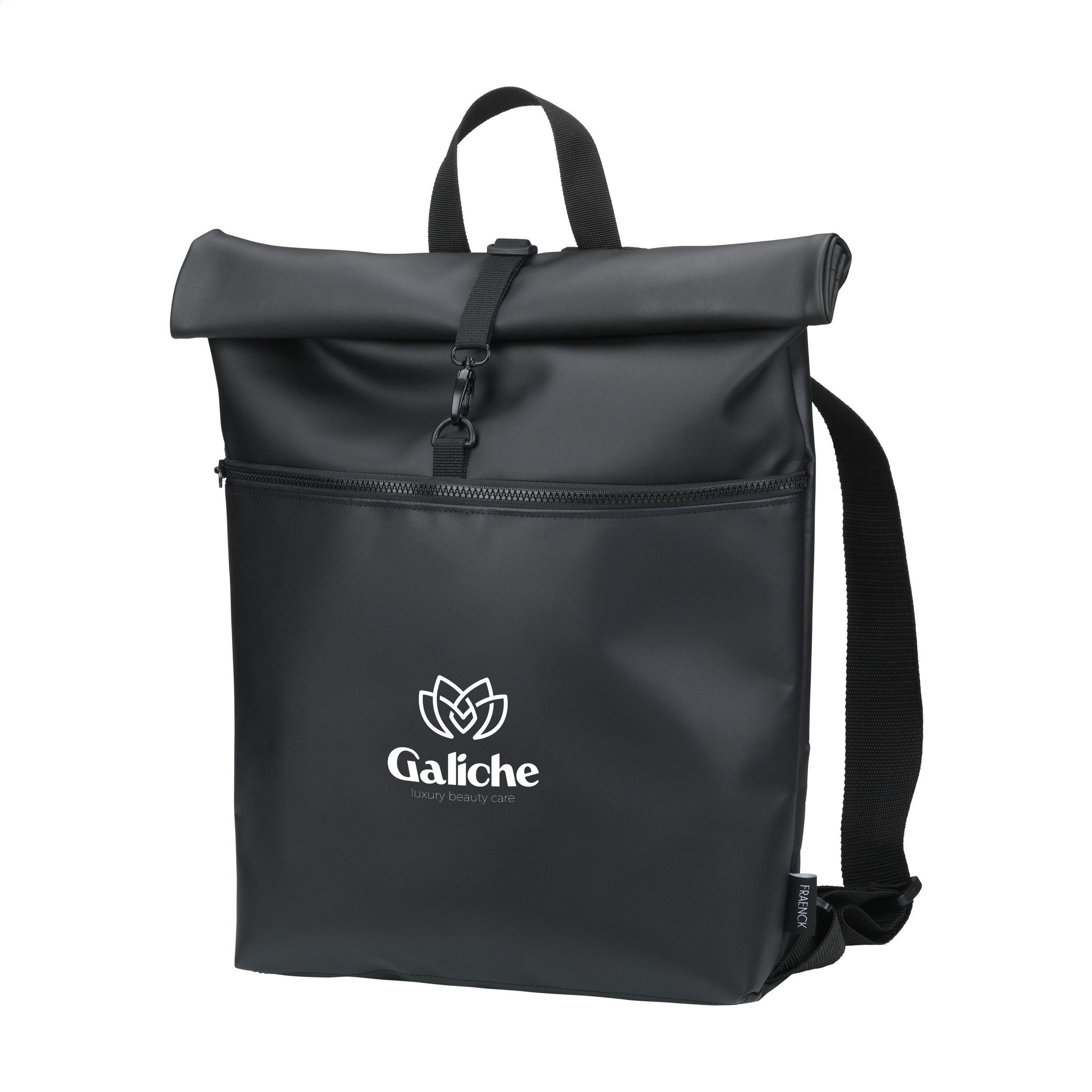 Robuster Rucksack der Marke Fraenck. Hergestellt aus Kunstleder und upgecyceltem Segeltuch. Das robuste und wasserabweisende Material stammt aus upgecycelten Stoffresten aus der Segelindustrie. Das großzügige Innenfach verfügt über ein zusätzliches Fach, in dem ein Laptop bis zu 17 Zoll Platz findet. Mit stabilem Reißverschluss, verstellbaren Schultergurten und einer Trageschlaufe. Ein zeitloses Design. Hergestellt in Holland. Fassungsvermögen ca. 14 Liter. Fraenck ist B-Corp-zertifiziert; die Kollektion wird nach den höchstmöglichen ökologischen und sozialen B-Corp-Standards hergestellt.