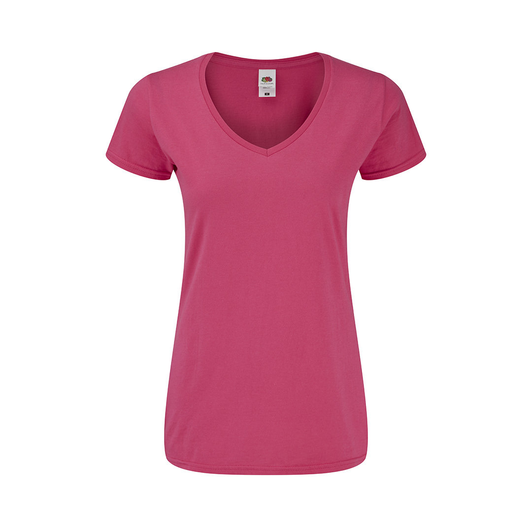 Farbiges Damen-T-Shirt Iconic V-Neck von Fruit Of The Loom. Hergestellt aus 100% gebürsteter Ringspinn-Baumwolle 150g / m2. Weiches Material und schmale Passform, mit Seitennähten für einen perfekten Sitz. Schmaler 1 x 1 gerippter V-Ausschnitt und passende Knopfleiste. Leicht abnehmbares Etikett und in einer breiten Farbpalette erhältlich. Größen XS, S, M, L, XL, XXL.