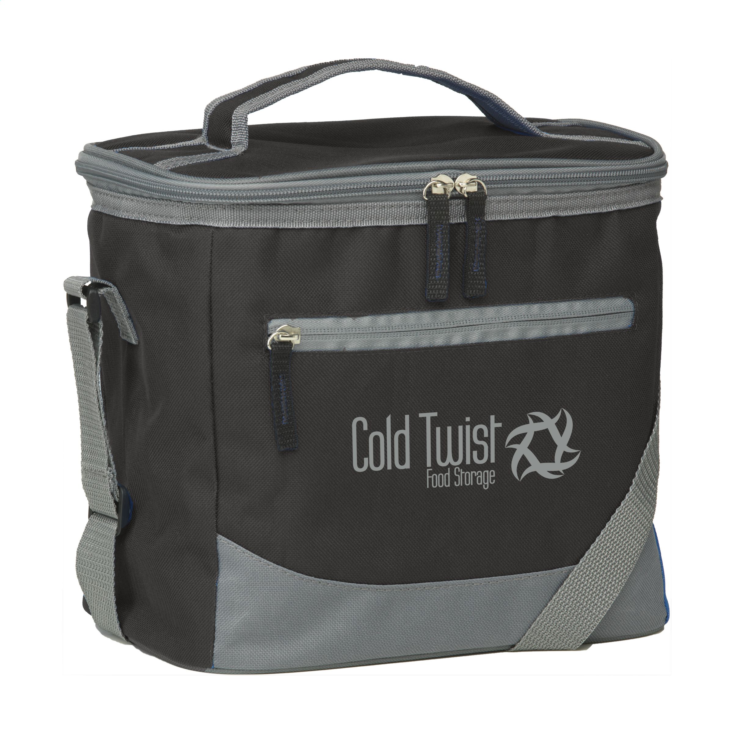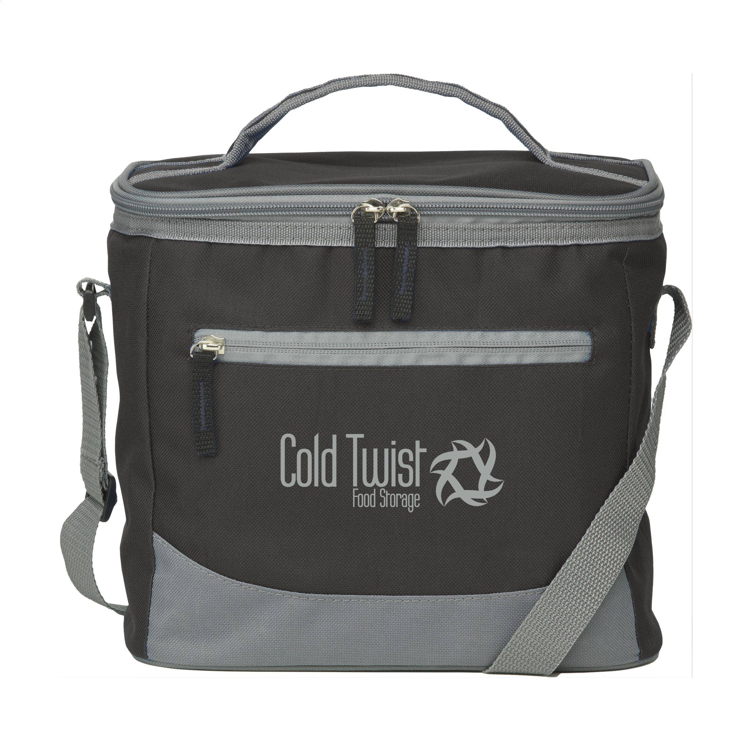 Kühltasche im praktischen Format. Aus 600D Polyester. Mit großem Kühlfach, Fronttasche mit Reissverschluss, Griff und anpassbarem Schultergurt. Passend für 12 Getränkedosen.