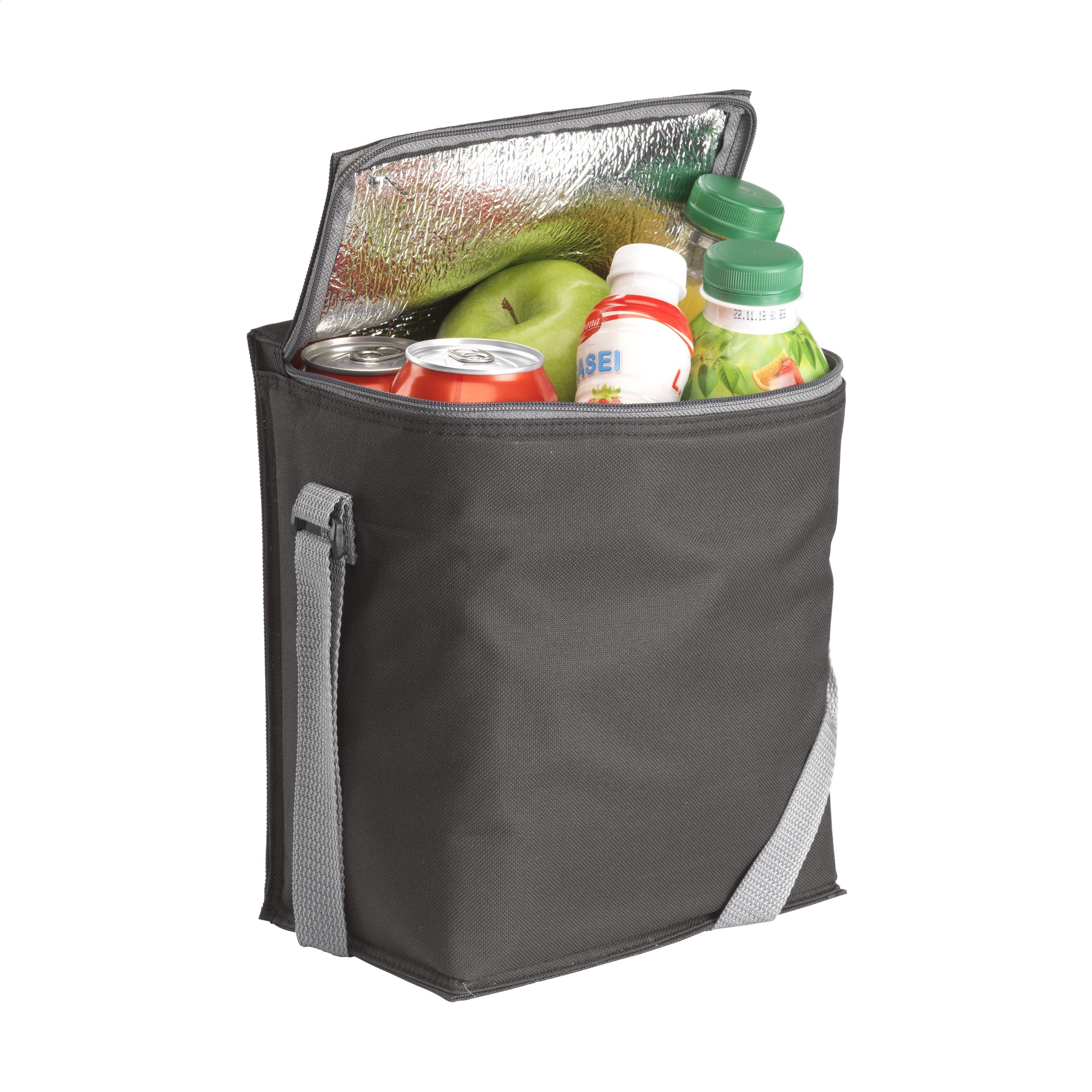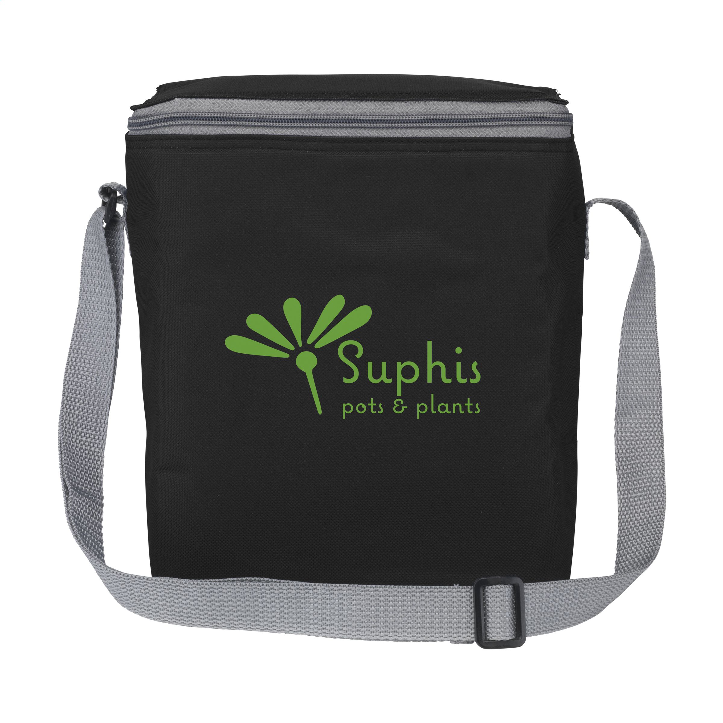 600D-Polyester-Kühltasche, geeignet für 6 Getränkeflaschen (Inhalt 500 ml) oder 12 Dosen. Mit Trageriemen.