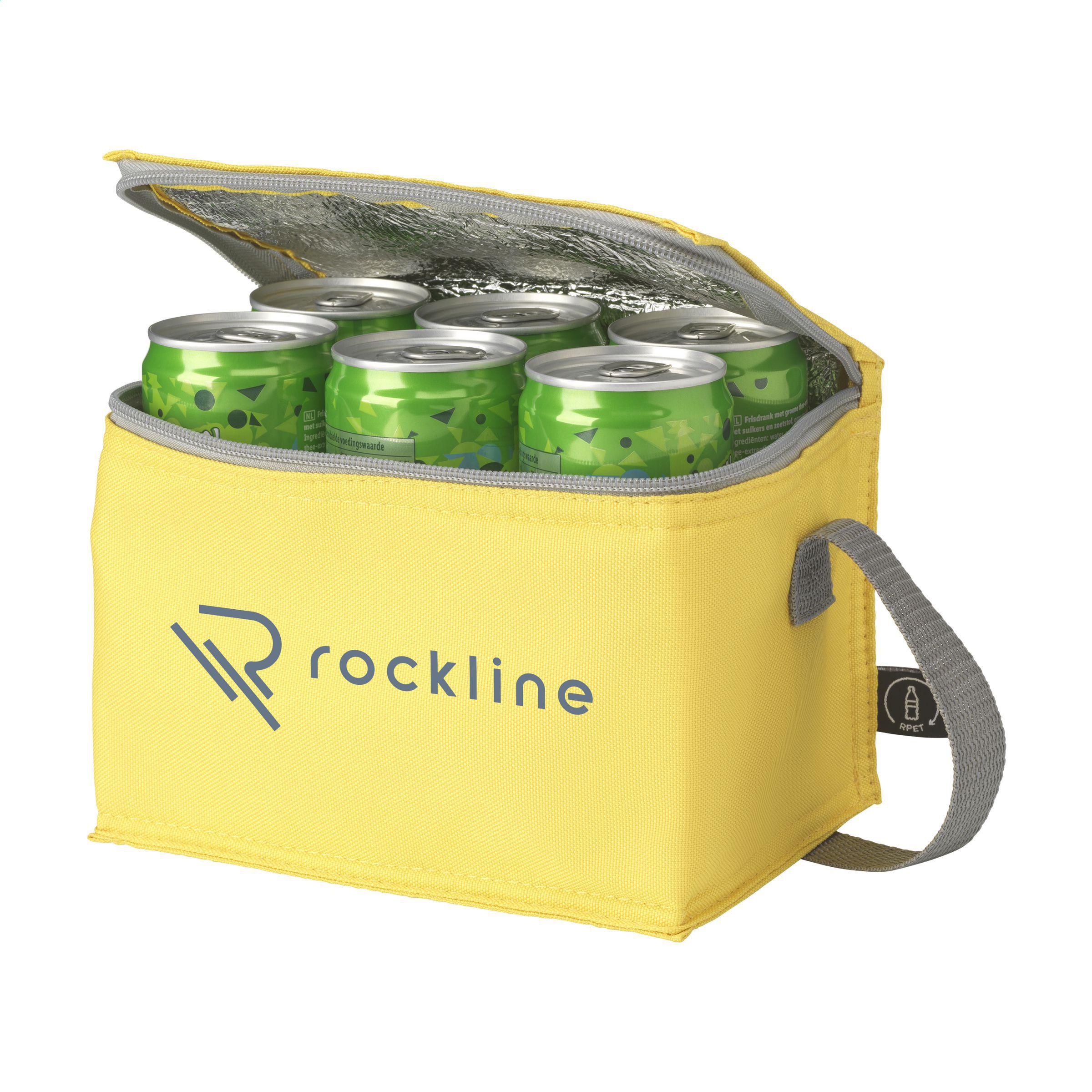 Kühltasche aus 600D-RPET-Polyester-Kühltasche. Geeignet für 6 Getränkedosen. Mit Trageriemen. GRS-zertifiziert. Recyceltes Material insgesamt: 51%. Fassungsvermögen ca. 3 Liter.