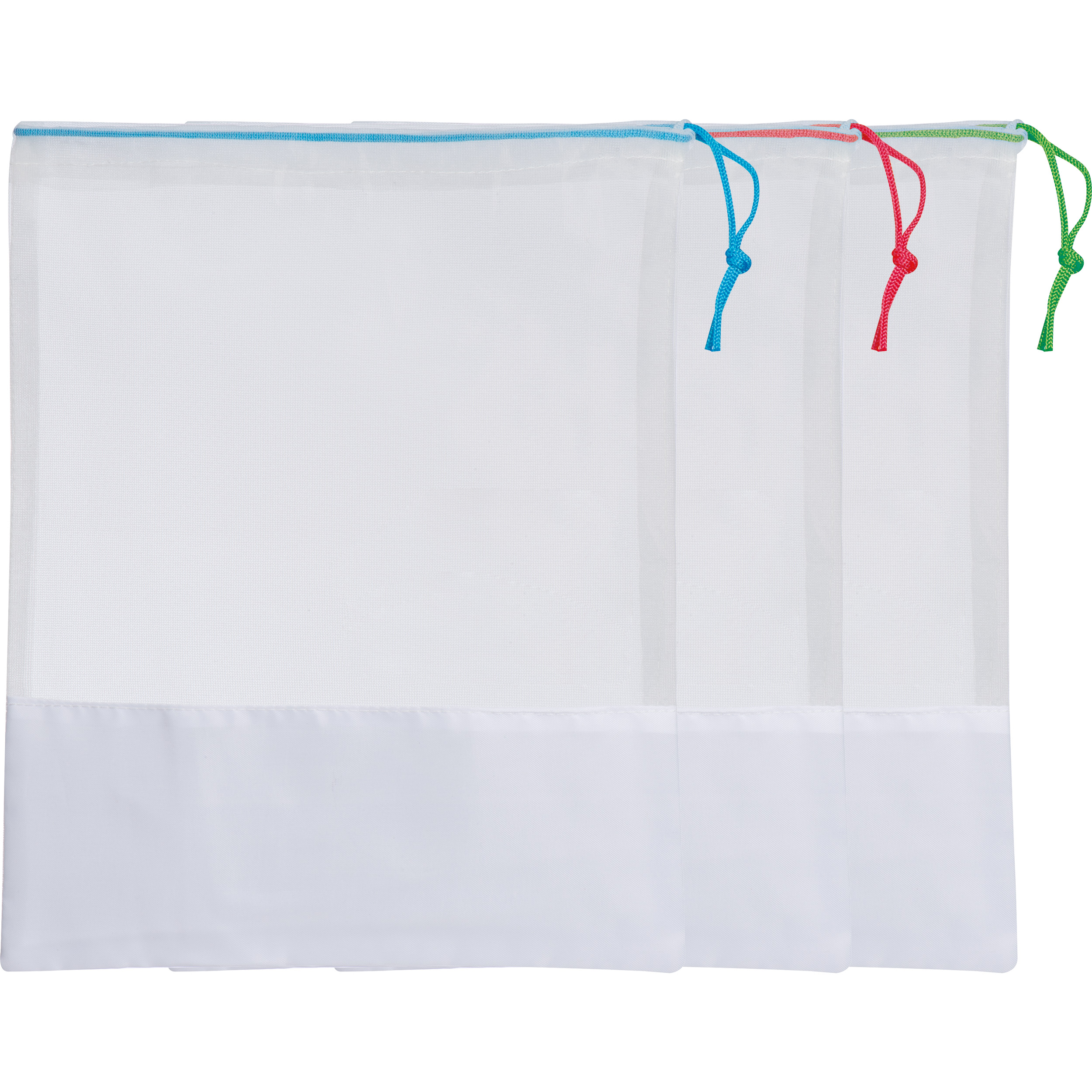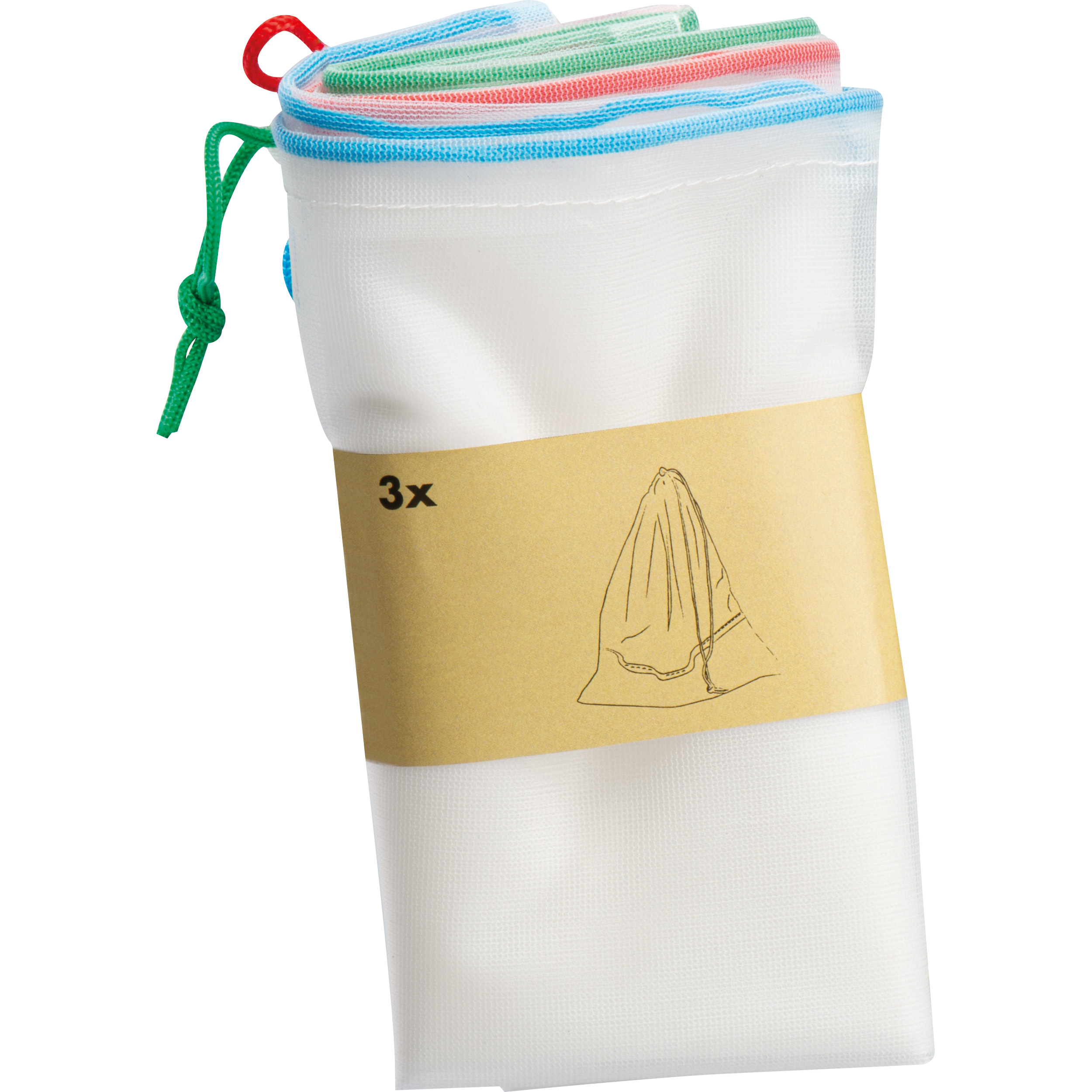 Perfekter Einkaufsbegleiter nicht nur für Obst und Gemüse. Das 3er-Set besteht aus PET (Netzteil) sowie im unteren Drittel aus 210D Polyester. Ihre Werbung drucken wir im unteren Drittel auf den Polyesterpart auf den Beutel mit dem blauen Band. Für 2C oder mehr, Preise auf Anfrage.