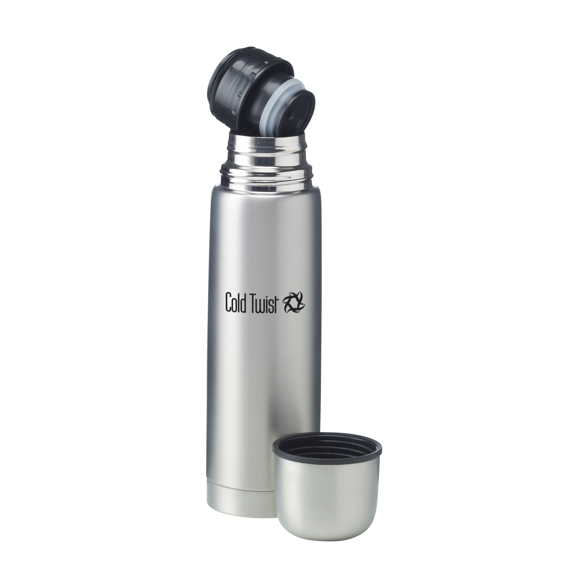 Doppelwandige, vakuumisolierte, rostfreie Edelstahl Thermoflasche mit doppeltem Schraubkopf und einem nützlichen Schanksystem. Auslaufsicher. Der Deckel ist auch als Trinkbecher zu gebrauchen. Abgerundet durch ein gefrostetes Metallfinish. Fassungsvermögen 500 ml. Wird einzeln in einem Kraftkarton geliefert.