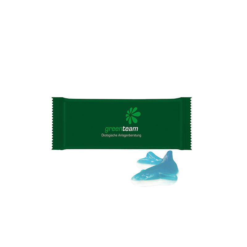 Beschreibung: Flowpack aus weißer, kompostierbarer Folie, individuell bedruckt. Inhalt: 1 Trolli Fruchtgummi "Haifisch" blau, mit weißem Schaumzuckerbauch, 8g, Sonderfarben und -geschmacksrichtungen ab 50.000 Stück auf Anfrage