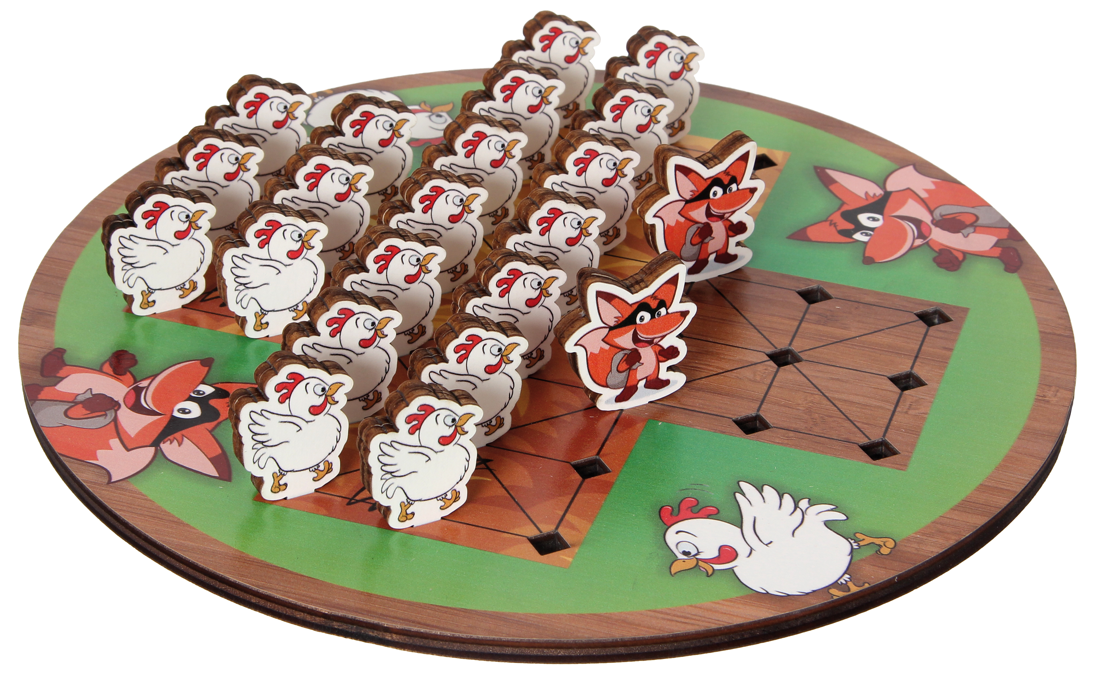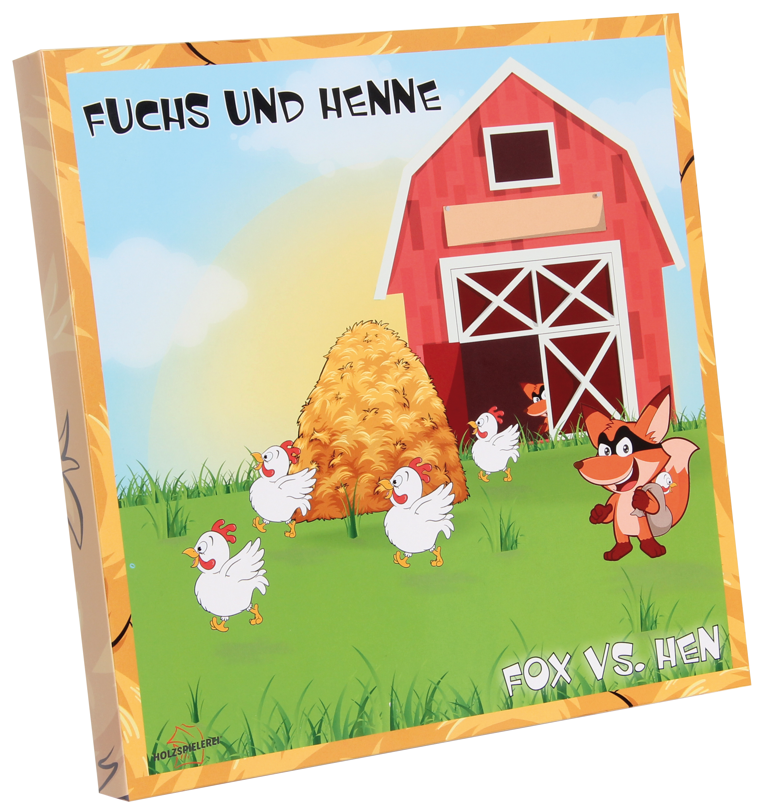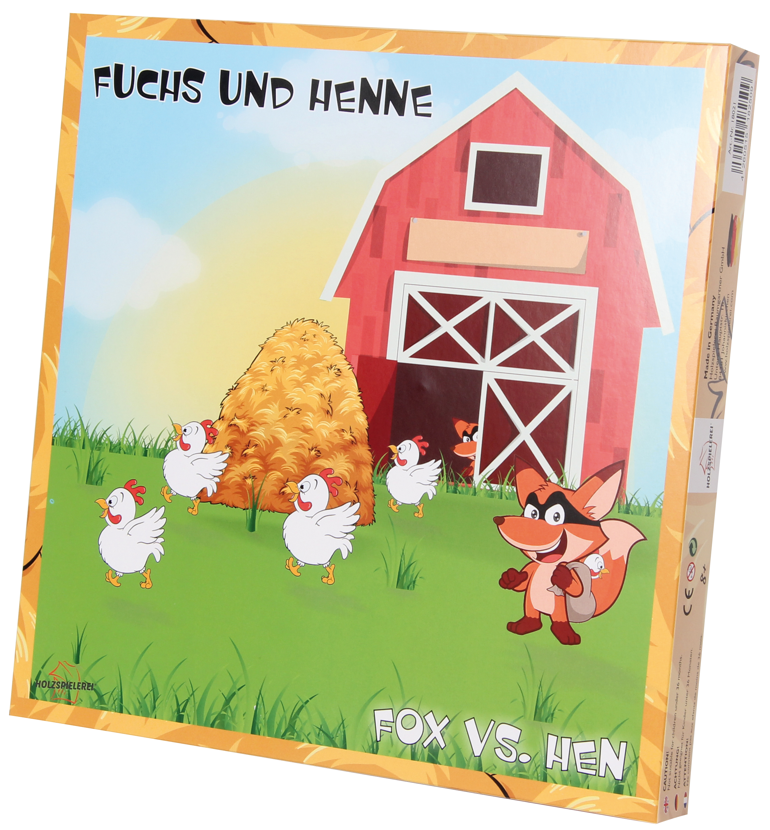 Die Hühner wollen Ihren Stall zurückerobern, in dem zwei hungrige Füchse auf sie warten. Ein Fuchs kann ein Huhn fressen", indem er über es springt. Dazu muss allerdings dahinter ein Feld frei sein. Ähnlich wie bei Halma. Inhalt: 1 Spielbrett, 2 Füchse und 20 Hühner. Die Spielfiguren müssen noch mit dem beigefügten Leim zusammengeklebt werden. "