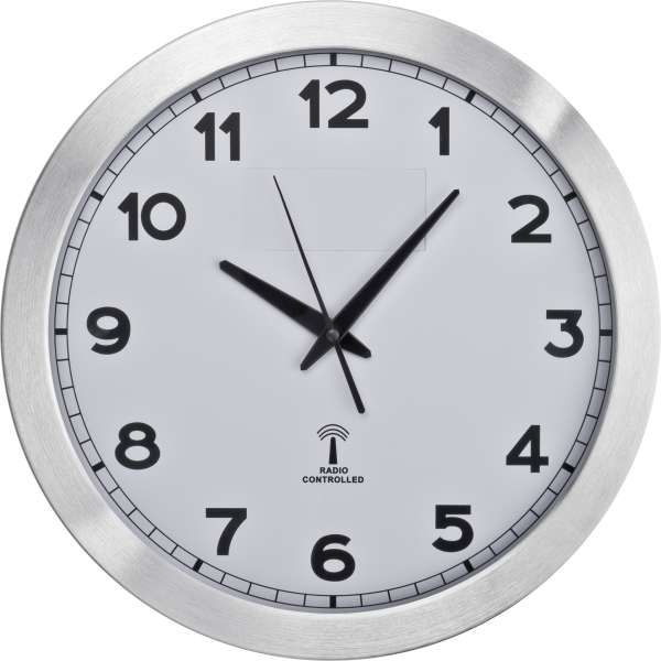 Große Funk Wanduhr - nur einmal aktivieren indem Sie die Batterie einlegen, dann kurz den Resetknopf drücken und die Uhr stellt sich von selbst ein. Ihre Werbung wird auf dem Plättchen unter der 12 angebracht.