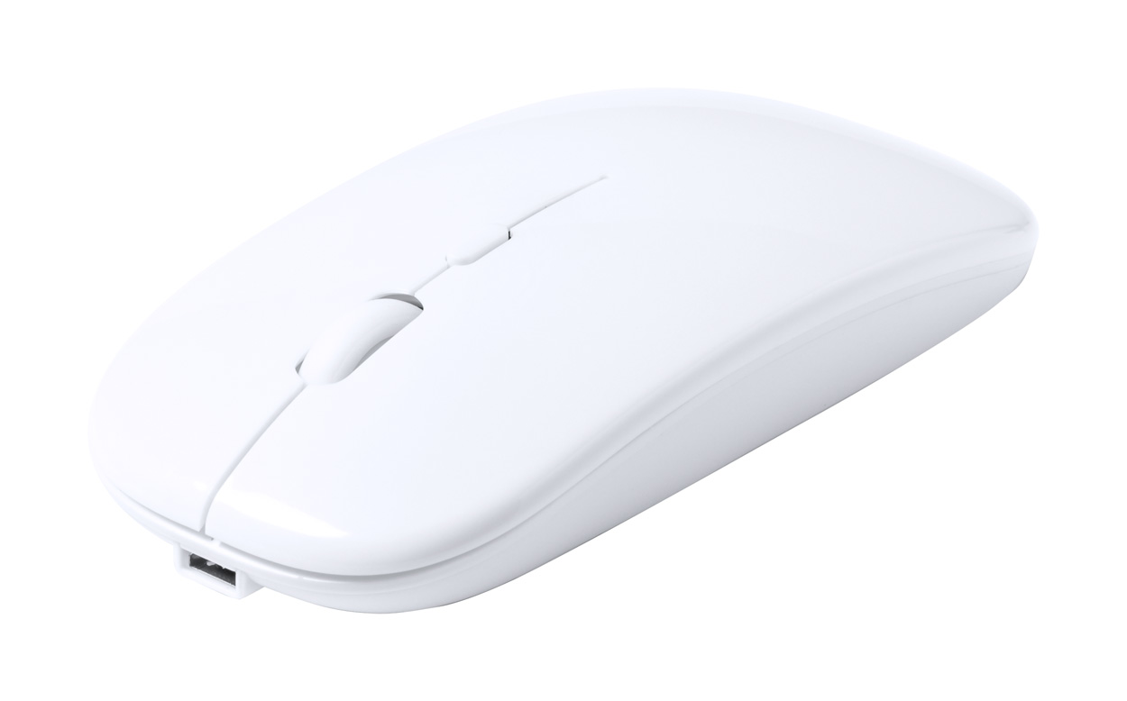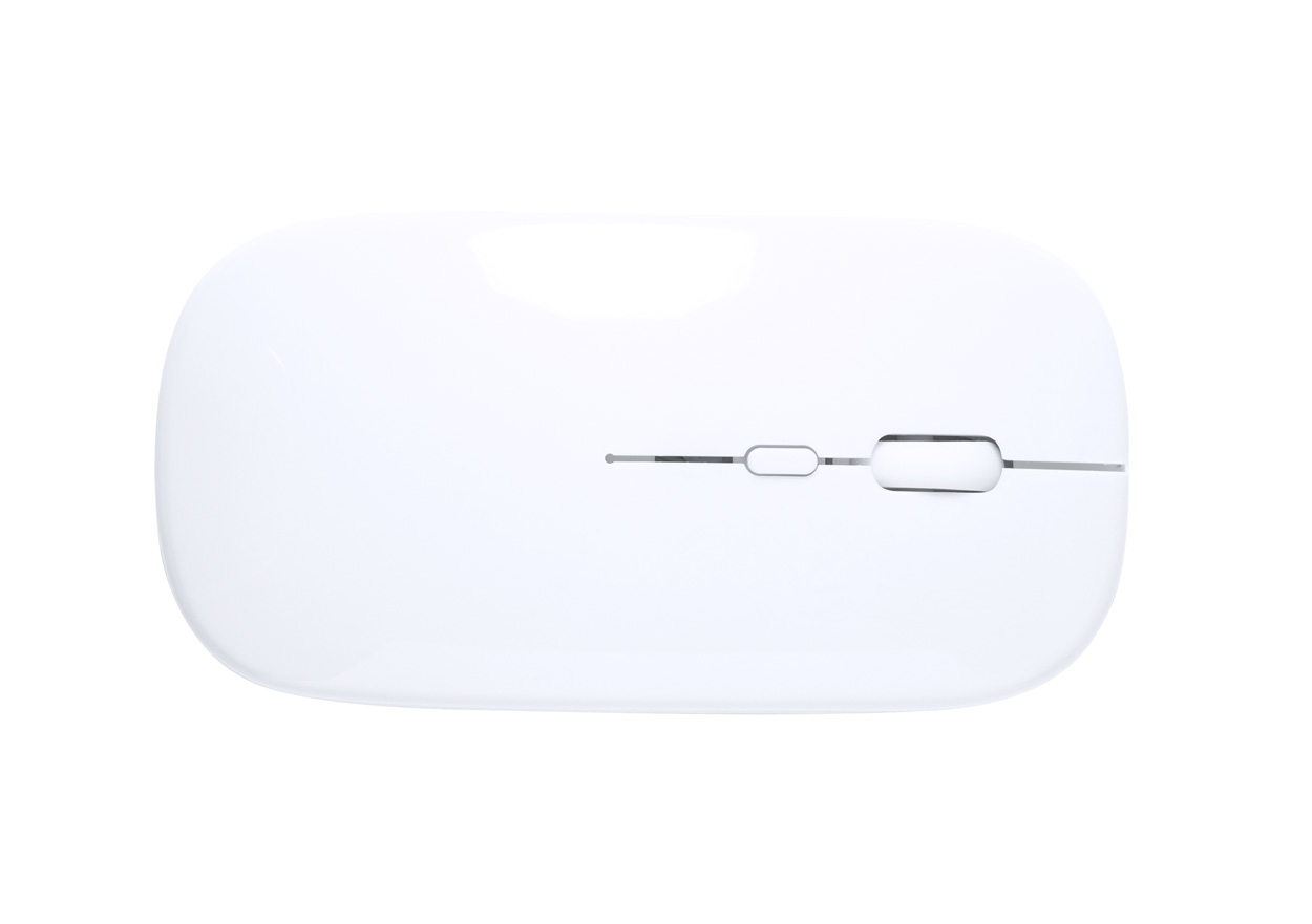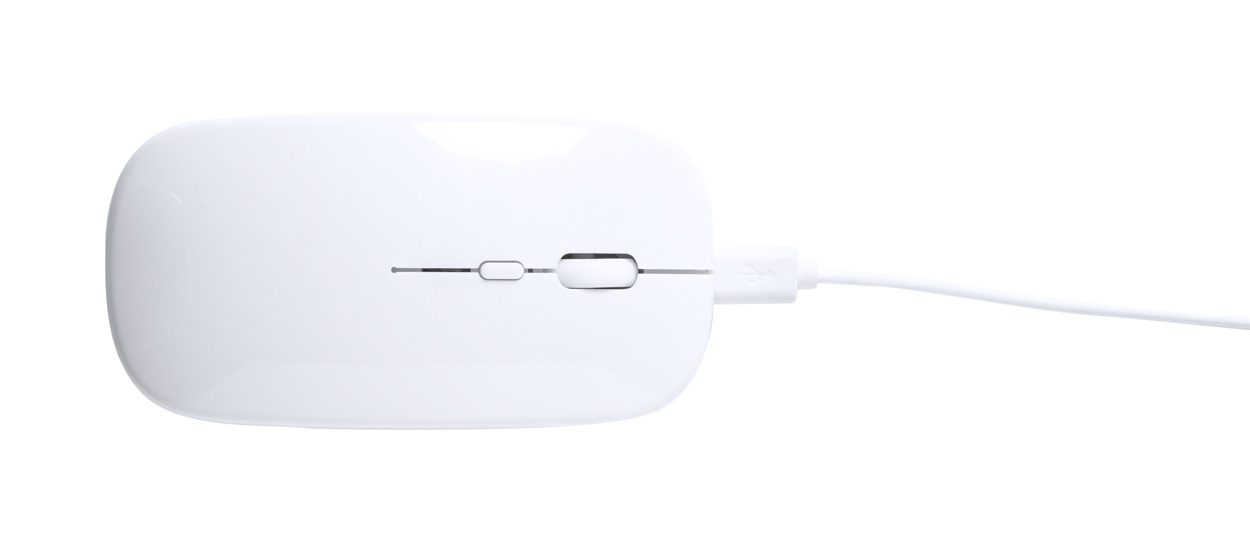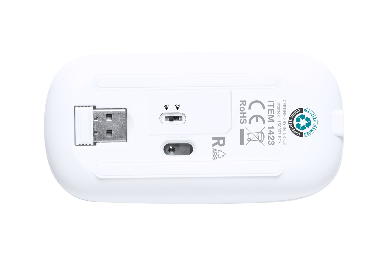 Optische Funkmaus mit Gehäuse aus recyceltem ABS-Kunststoff und eingebautem Akku. Inkl. USB-Ladekabel.