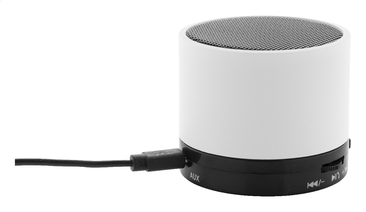 Kabelloser Lautsprecher aus recyceltem ABS in gummiertem Gehäuse mit Metallgitter und wiederaufladbarem Akku (300 mAh). Mit Freisprechfunktion und MP3-Wiedergabe über Micro-SD-Karte. Inklusive USB-Ladekabel.