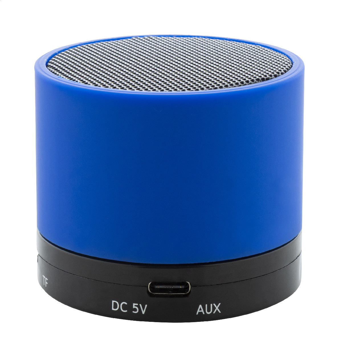 Kabelloser Lautsprecher aus recyceltem ABS in gummiertem Gehäuse mit Metallgitter und wiederaufladbarem Akku (300 mAh). Mit Freisprechfunktion und MP3-Wiedergabe über Micro-SD-Karte. Inklusive USB-Ladekabel.