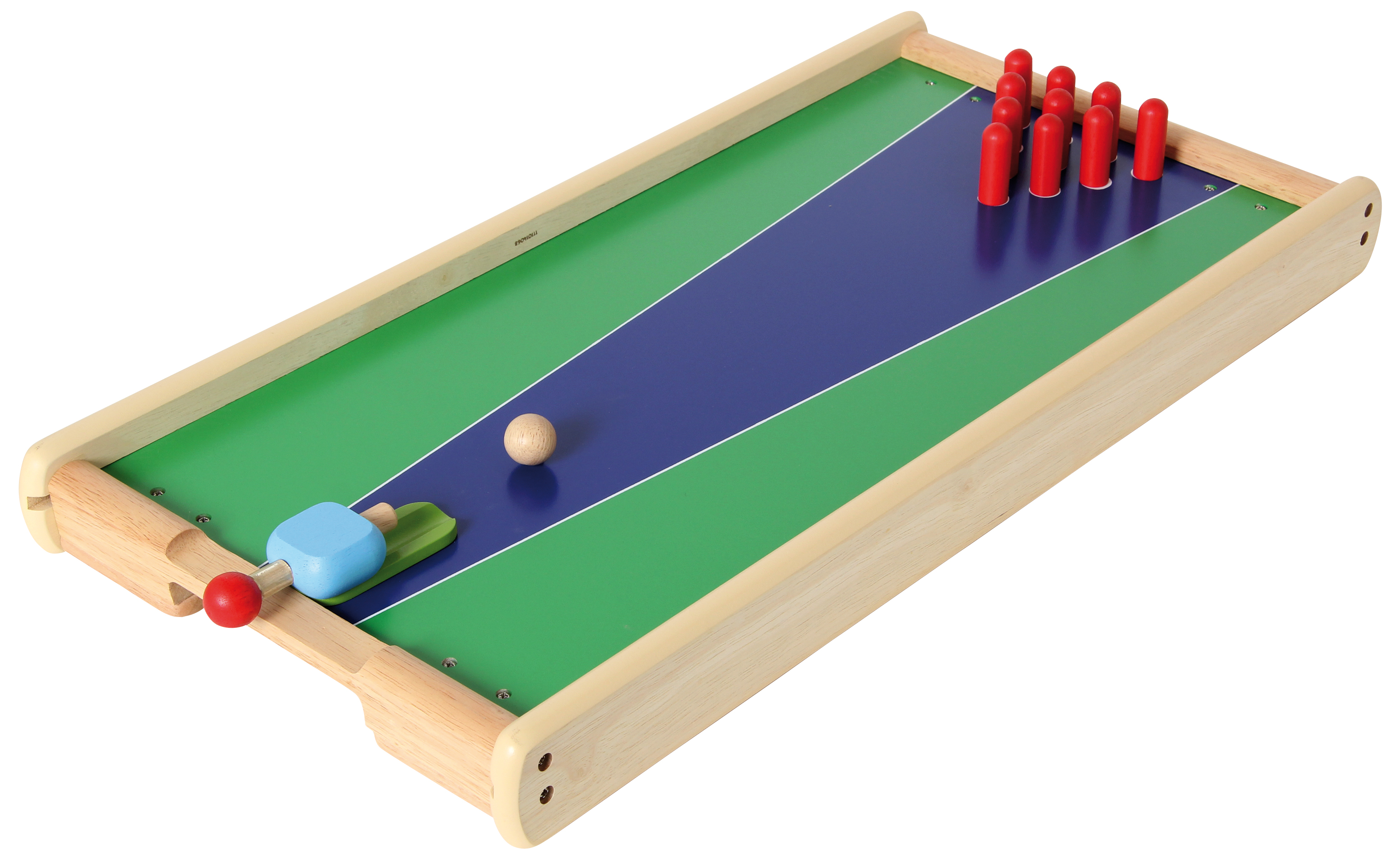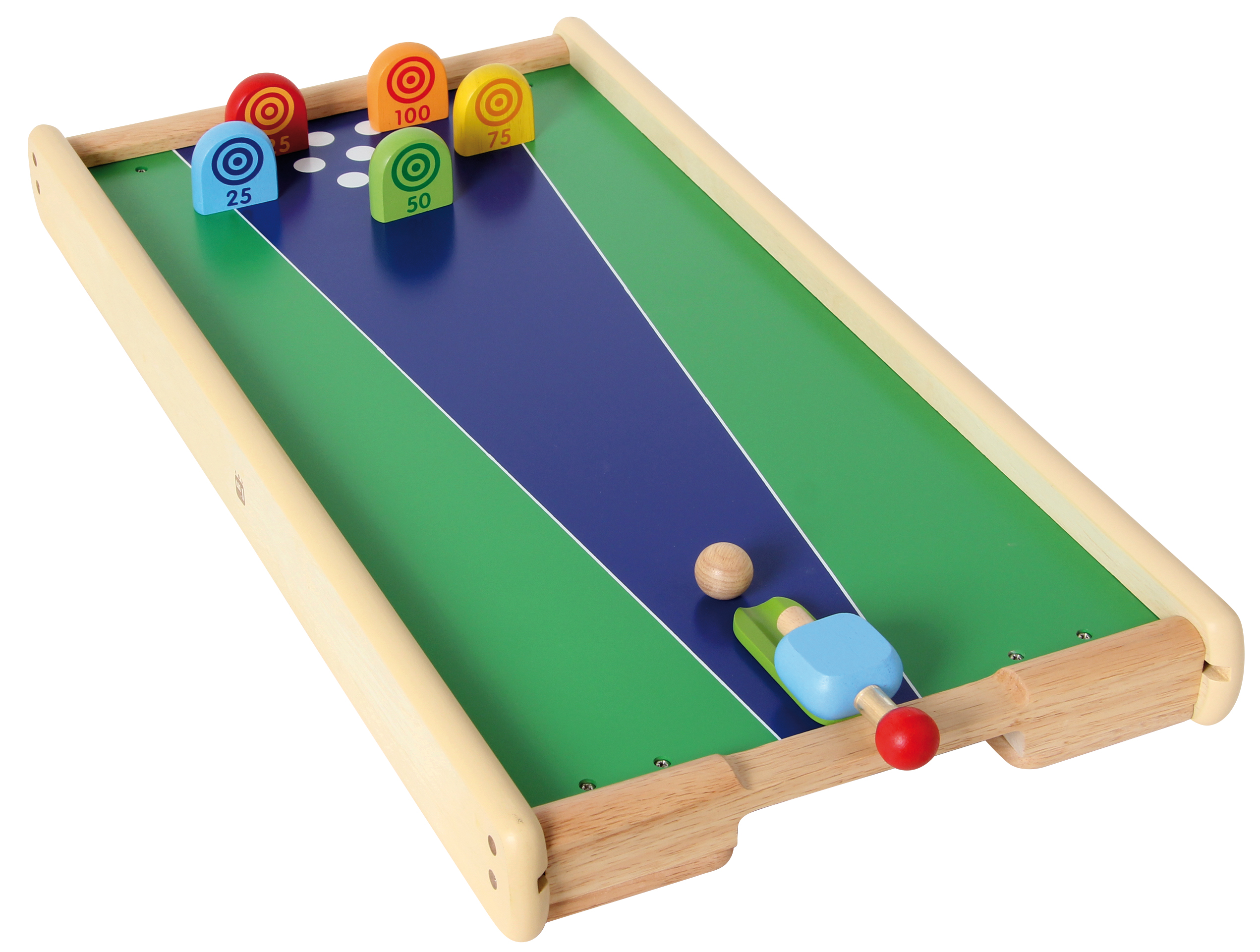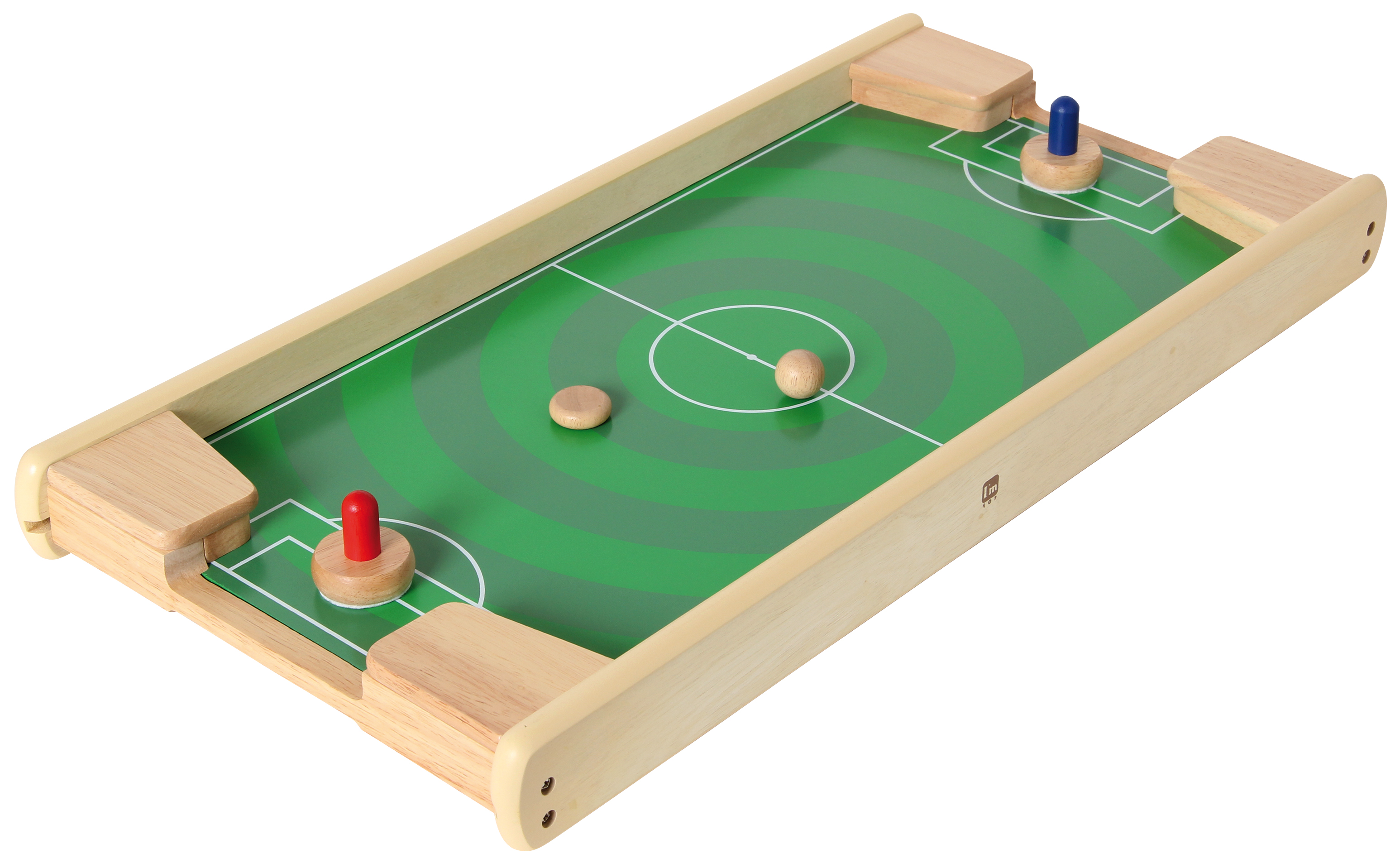 Drei Spielideen in einem: Fußball, Bowling und Zielschießen. Ab 3 Jahren. Das Spiel besteht aus einem massiven, hölzernen Spielbrett (beidseitig bespielbar!), einem Ball, einem Puck, zehn Pins, zwei Punkte-Zählern, zwei Hand-Kickern und fünf frei stehenden Zielen.