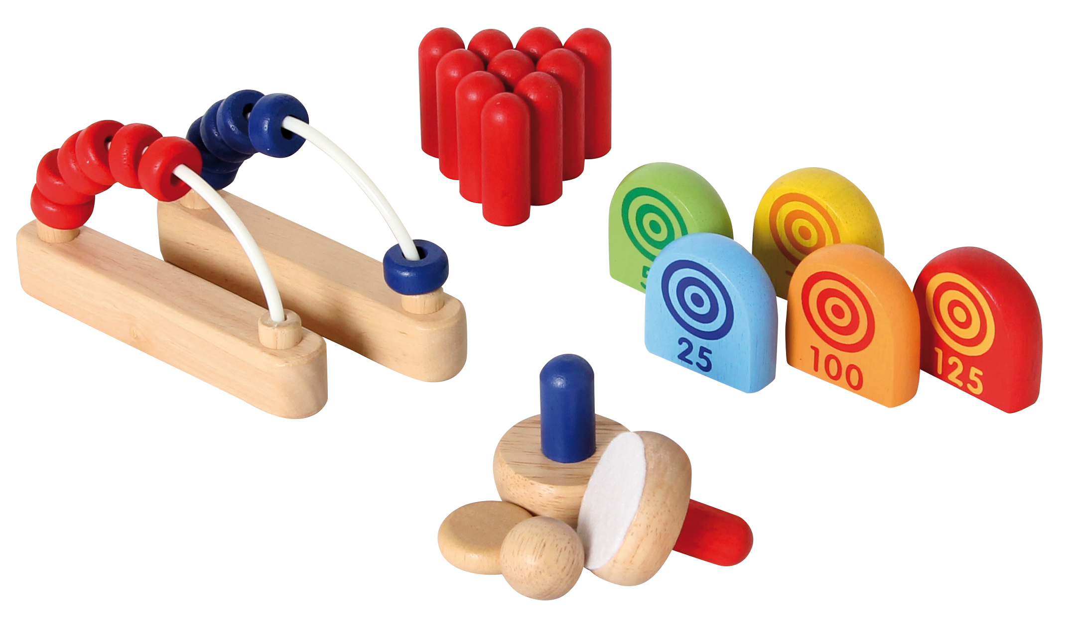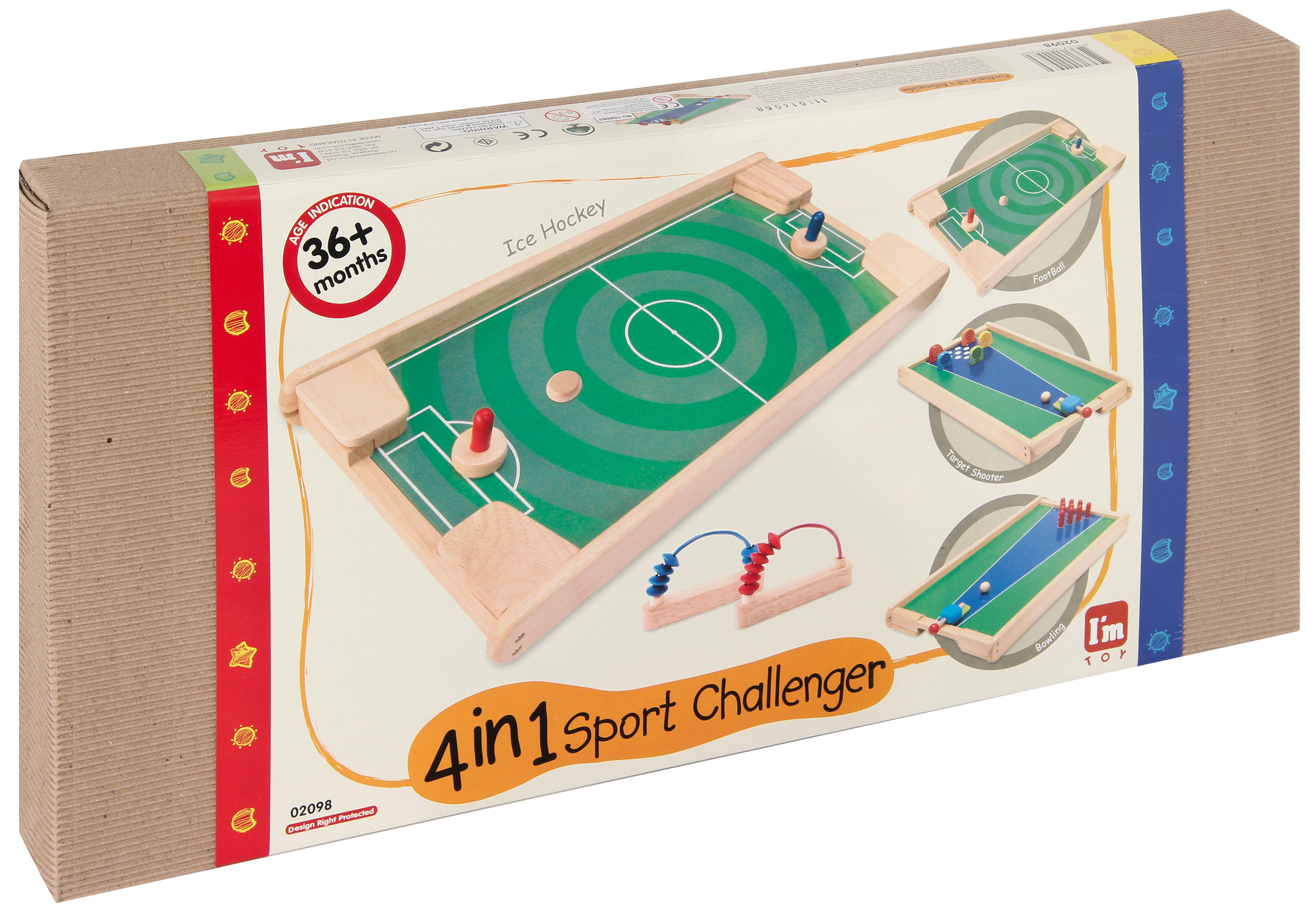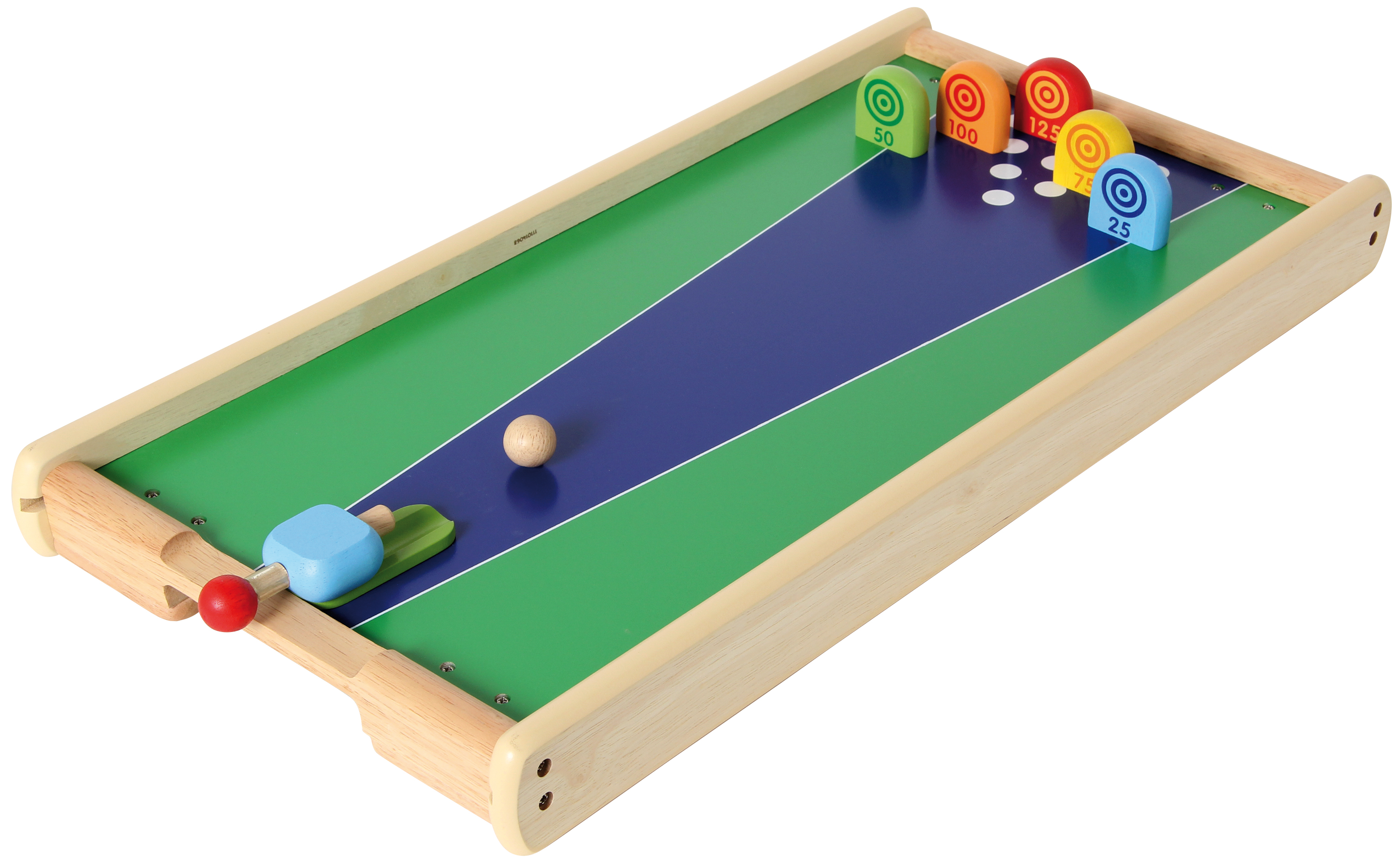 Drei Spielideen in einem: Fußball, Bowling und Zielschießen. Ab 3 Jahren. Das Spiel besteht aus einem massiven, hölzernen Spielbrett (beidseitig bespielbar!), einem Ball, einem Puck, zehn Pins, zwei Punkte-Zählern, zwei Hand-Kickern und fünf frei stehenden Zielen.