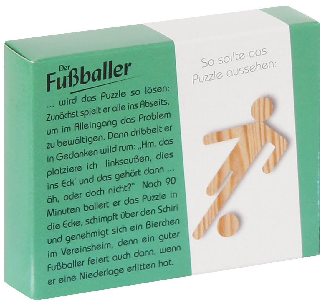 So puzzelt ein Fußballer aus 13 Teilen einen Stürmer: Erst spielt er alle ins Abseits. Dann entwickelt er eine Strategie: Hmm, das platziere ich linksaußen ... Nach 90 Minuten ballert er das Puzzle ins Eck, schimpft über den Schiri und genehmigt sich ein Bierchen im Vereinsheim, denn ein guter Fußballer feiert auch eine Niederlage.