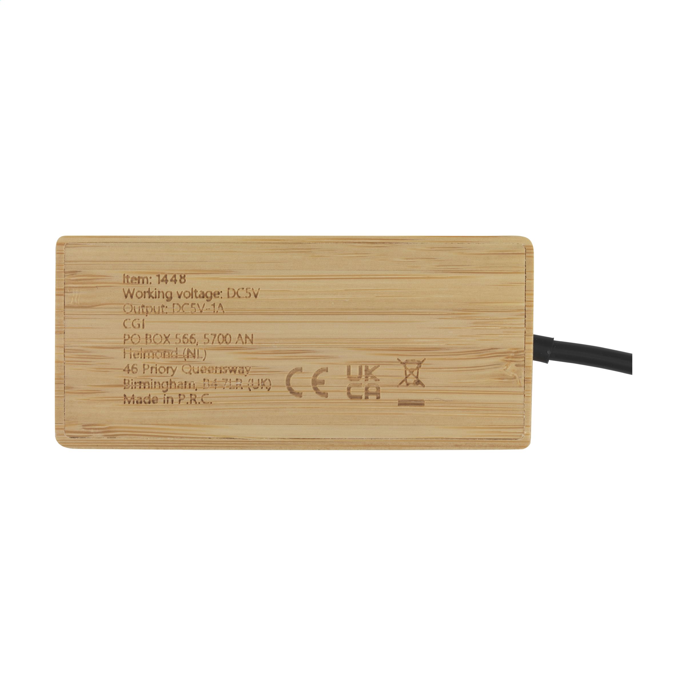 USB 2.0-HUB mit FSC 100 % Bambusgehäuse. Ausgestattet mit 1 USB-A-Anschluss und 3 USB-C-Anschlüssen zum Anschluss weiterer Geräte. Inklusive Typ-C-Kabel und Gebrauchsanweisung. Bambus ist ein natürliches Material. Deshalb kann die Farbe je nach Produkt variieren. Pro Stück in einer Verpackung.
