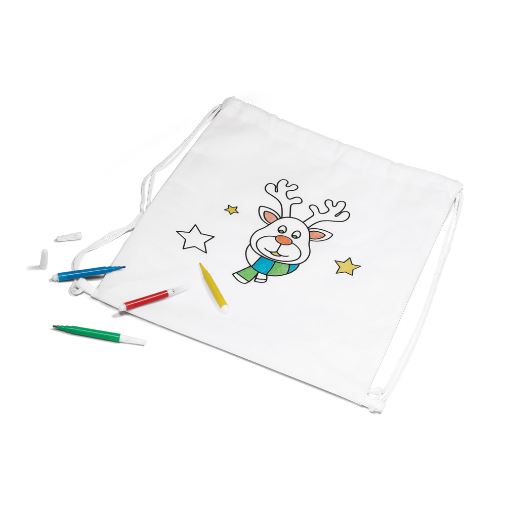 Turnbeutel zum Ausmalen aus Non-Woven (80 g / m²) mit Ausmalbildern und Innentasche. 4 Filzstifte enthalten. 300 x 350 mm