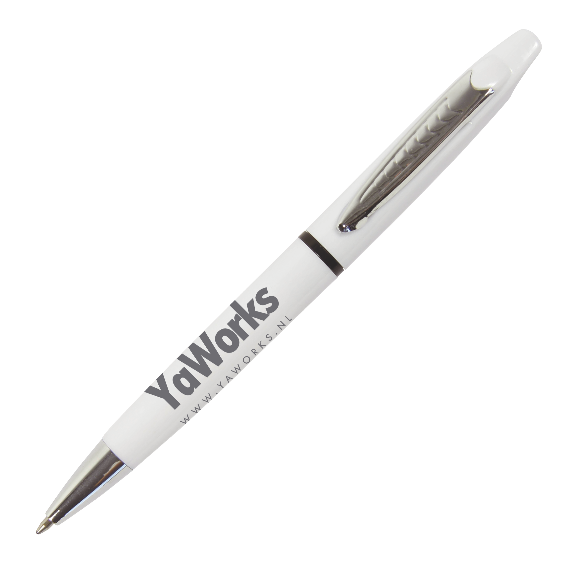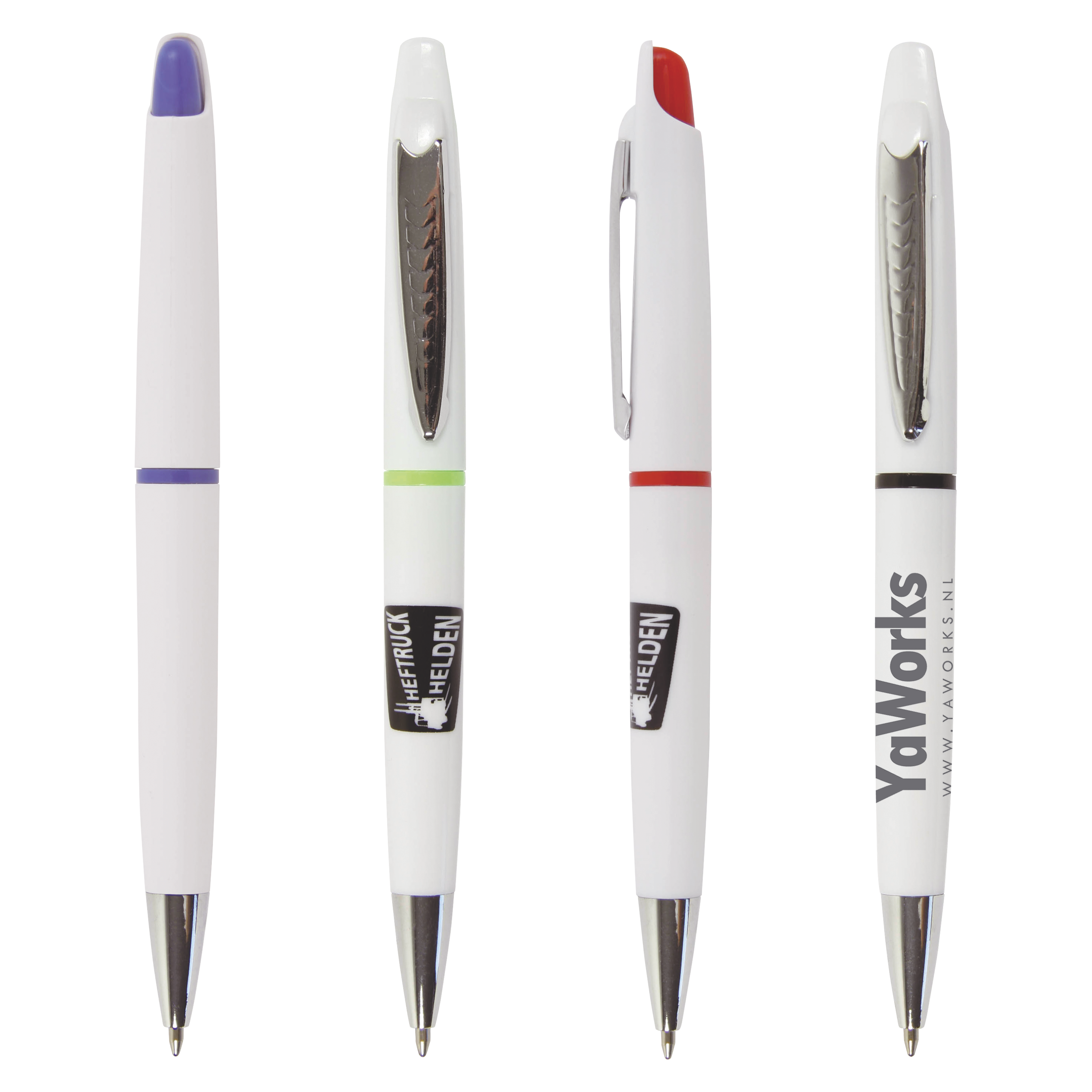 GOZO Plastik-Kugelschreiber Peekay in weiß mit Clip, Spitze aus Metall und blau schreibende Mine. Drücker und Ring lieferbar in mehreren Farben.