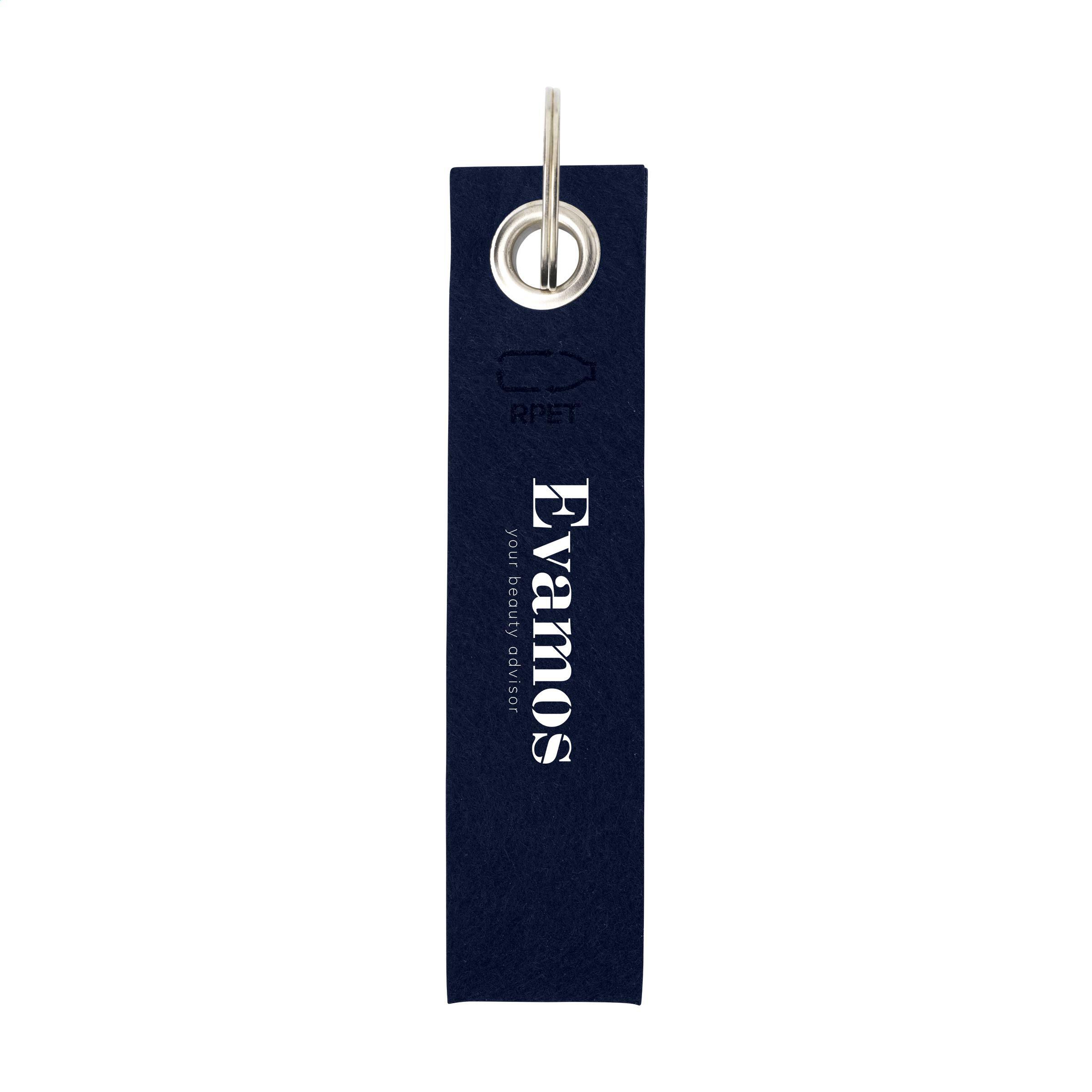Schlüsselanhänger aus RPET-Filz. Dieser Filz wird aus recycelten PET-Flaschen und recycelten Textilien hergestellt. Ausgestattet mit einem robusten Schlüsselring. GRS-zertifiziert. Recyceltes Material insgesamt: 60%.