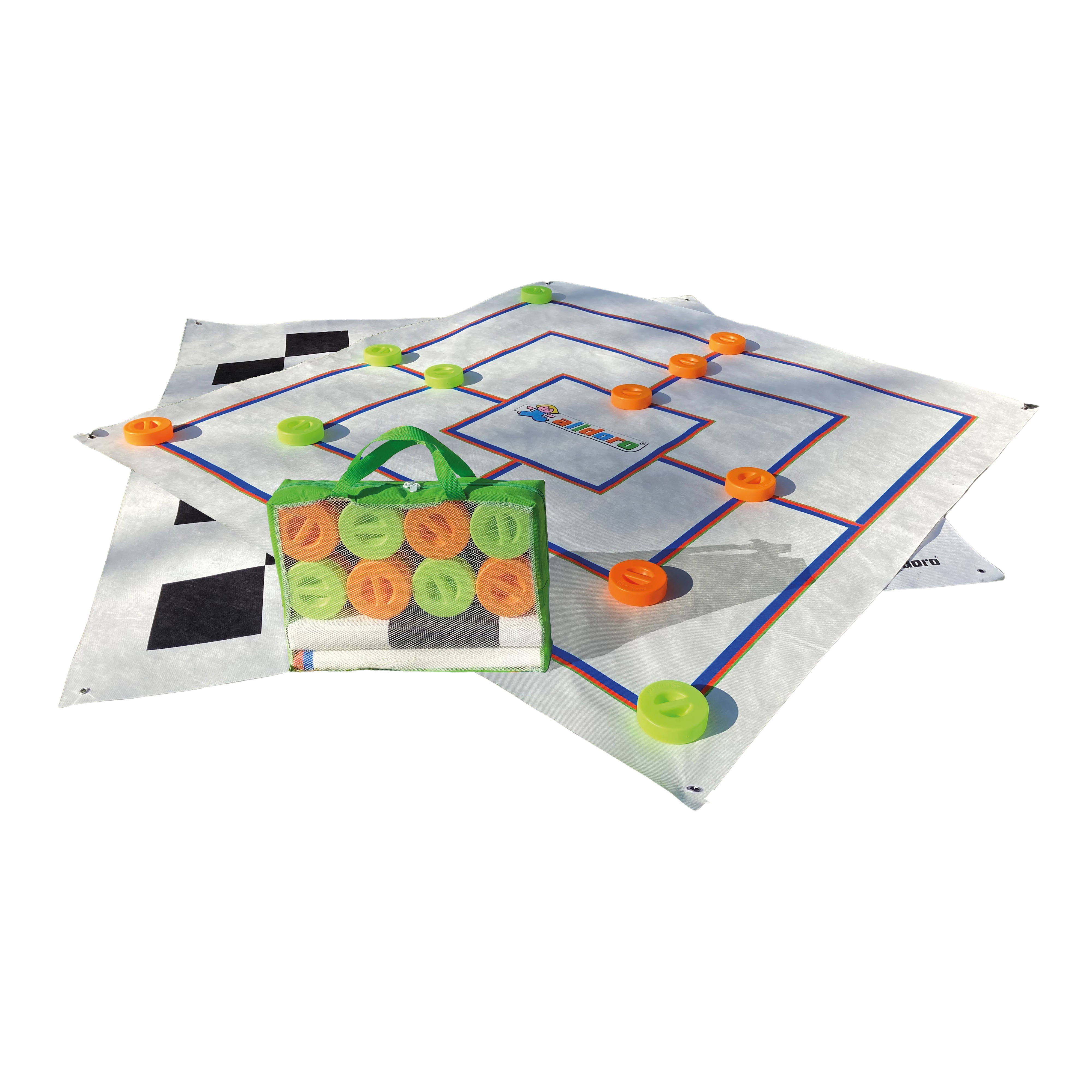 Mit zwei extra großen Spielflächen je 158 x 158cm und 24 großen Spielsteinen mit Haltegriff. Für die Befestigung in der Wiese sind 4 Haken im Lieferumfang enthalten. Verpackt in praktischer Tragetasche. Ideal für Draußen aber auch für Drinnen.