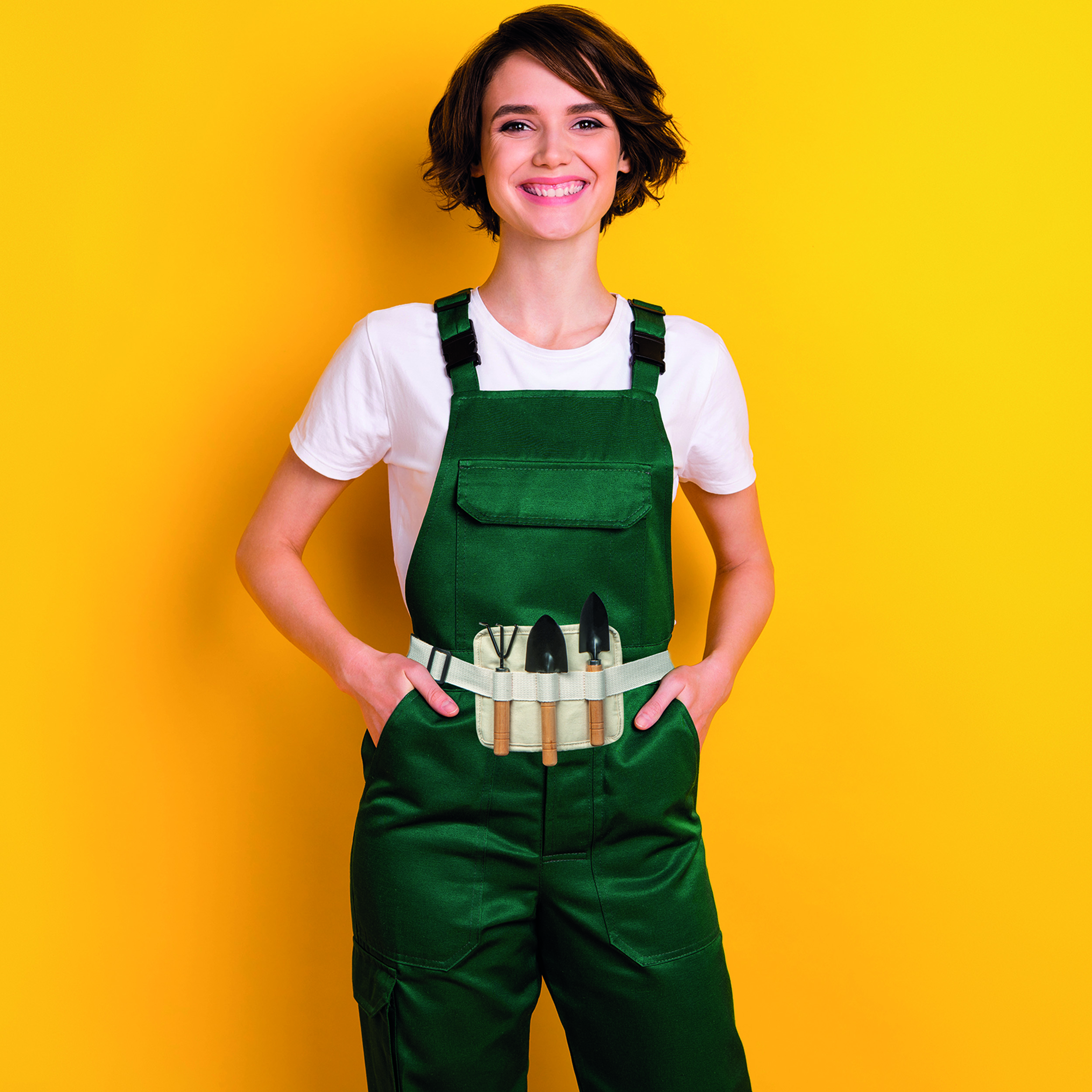 Praktischer Gartenhelfer! Gürtel aus Baumwolle mit Klickverschluß und verstellbarem Gürtel, Harke sowie zwei verschieden großen Spitzspaten. Ihre Werbung drucken wir oberhalb der Schlaufen.