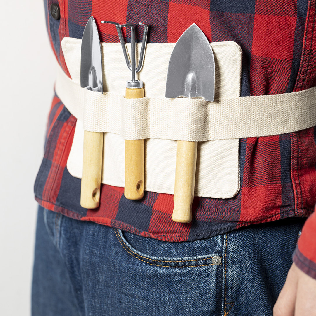 Gartenset mit 3 Zubehörteilen aus Metall mit Holzgriff. Inklusive großer Schaufel, kleiner Schaufel und Rechen. Mit Baumwoll-Transport-Gürteltasche und verstellbarem Klickverschluss Präsentiert in einer attraktiven Öko-Designbox.