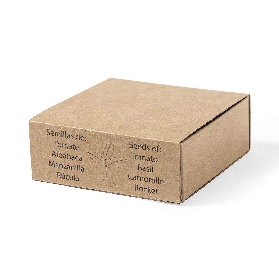 Gemüsegarten-Set mit Samen für Tomaten, Basilikum, Rucola und Kamille. Präsentiert in einer Schachtel aus recyceltem Karton mit Pflanzanleitung, Made in Europe-Emblem und mit 4 unabhängigen Fächern.
