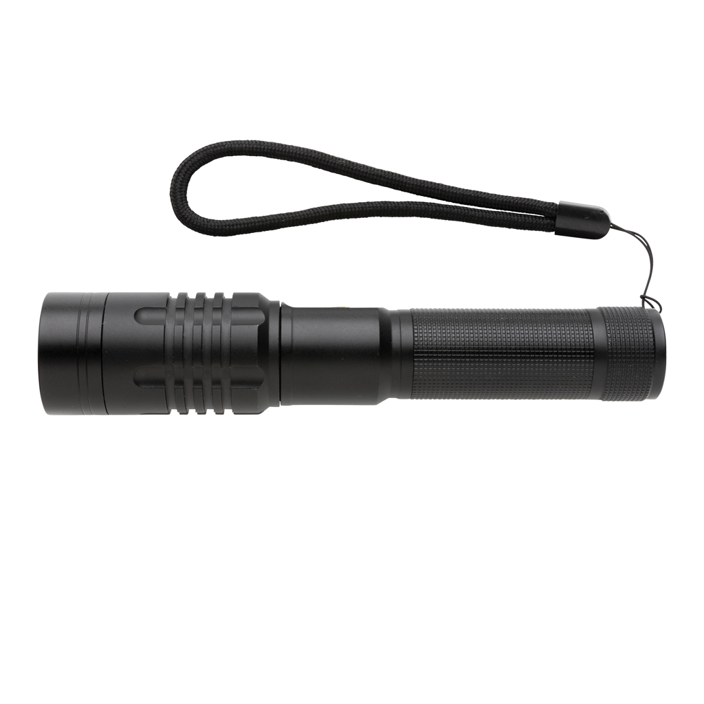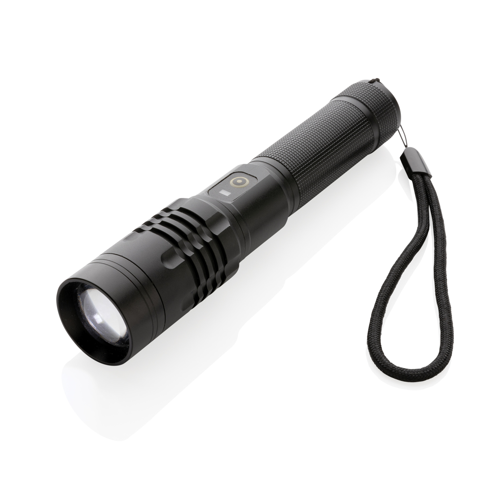 Funktionalität, Leistung und Design vereinen sich in dieser wiederaufladbaren Taschenlampe. Das hochwertige Gehäuse aus Aluminiumlegierung liegt perfekt in der Hand. Mit dem Premium-Fokuslicht können Sie das Licht bis zu 2000-fache zoomen. Aufgrund des IP4-Ratings ist sie wetterfest und kann daher problemlos nach draußen getragen werden. Die leistungsstarke Glühbirne erzeugt bis zu 1000 Lumen und einen Lichtstrahl, der bis zu 500 Meter reicht. Nie wieder Batterien austauschen, denn Sie laden den Akku einfach per USB wieder auf. Die hochwertige Glühbirne verfügt über 5 Modi inklusive SOS-Funktion. Der 2000mAh-Akku ermöglicht eine Nutzung von bis zu 4 Stunden mit einer einzigen Ladung.