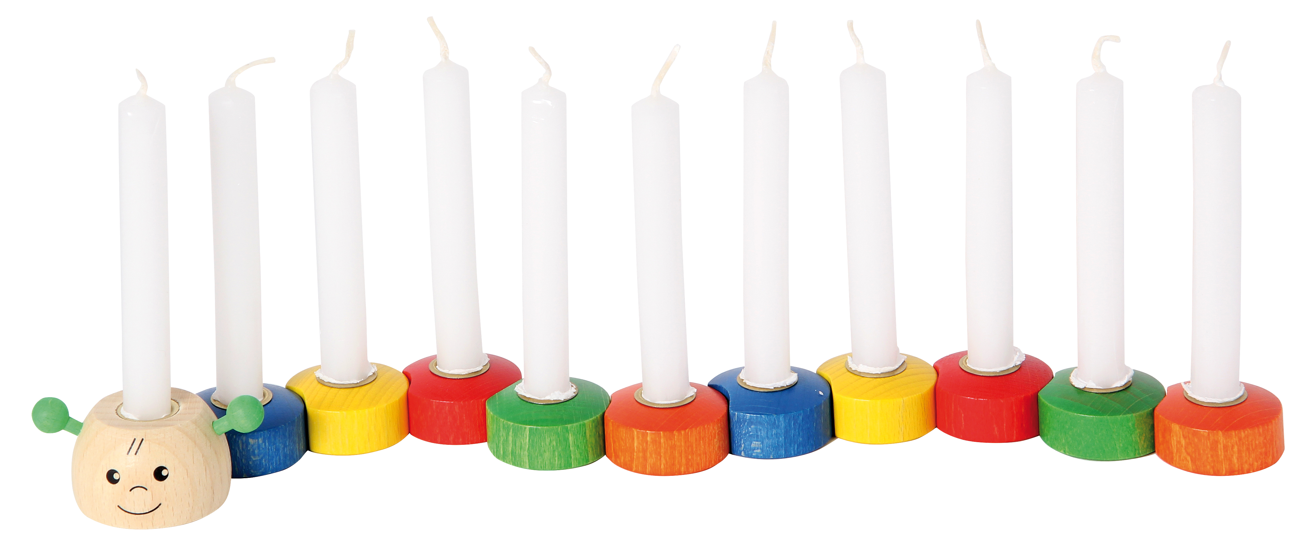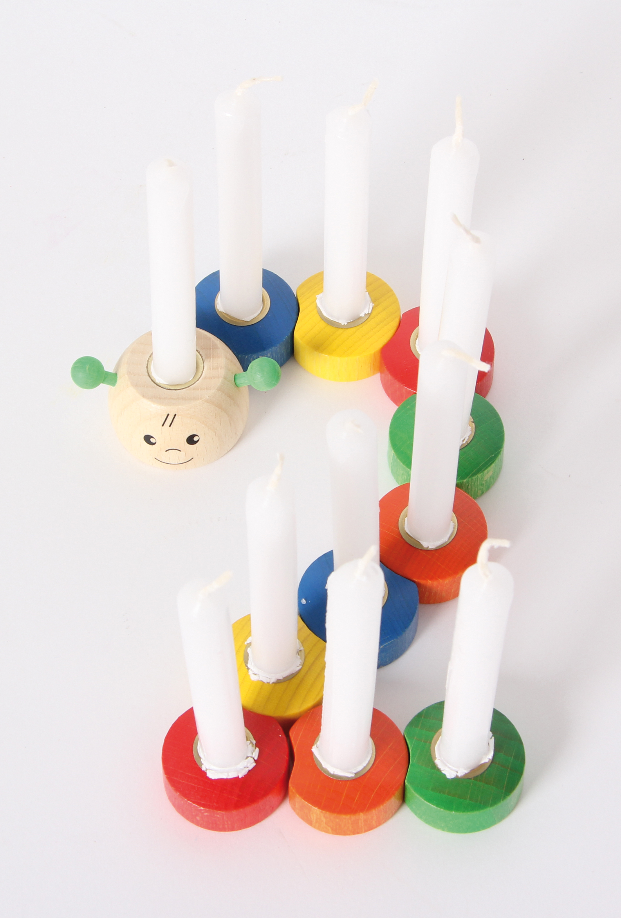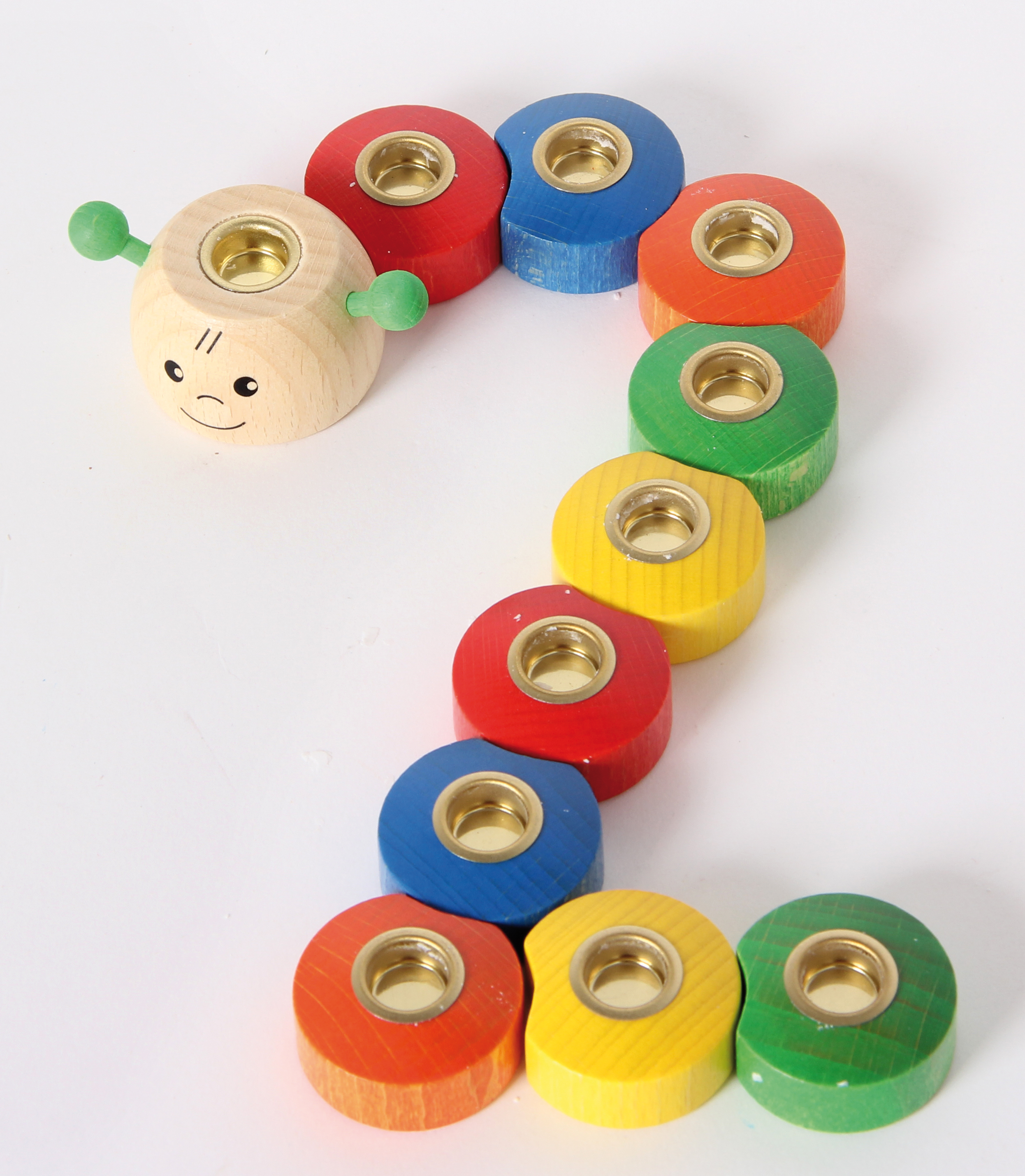 Das Set besteht aus einem Lebenslicht und zehn Geburtstagskerzen, einem Raupenkopf und zehn kleinen Kerzenständern, die Sie in beliebige Zahlen und Formen legen können.