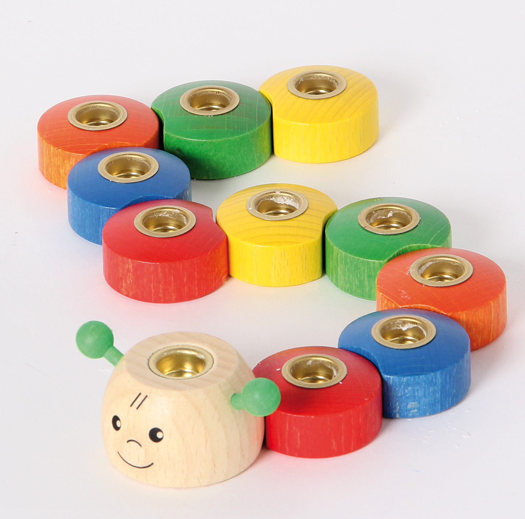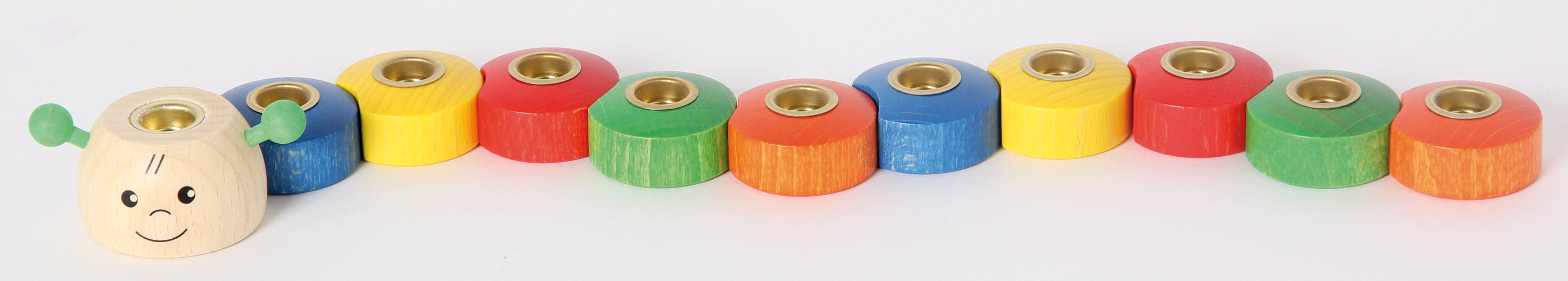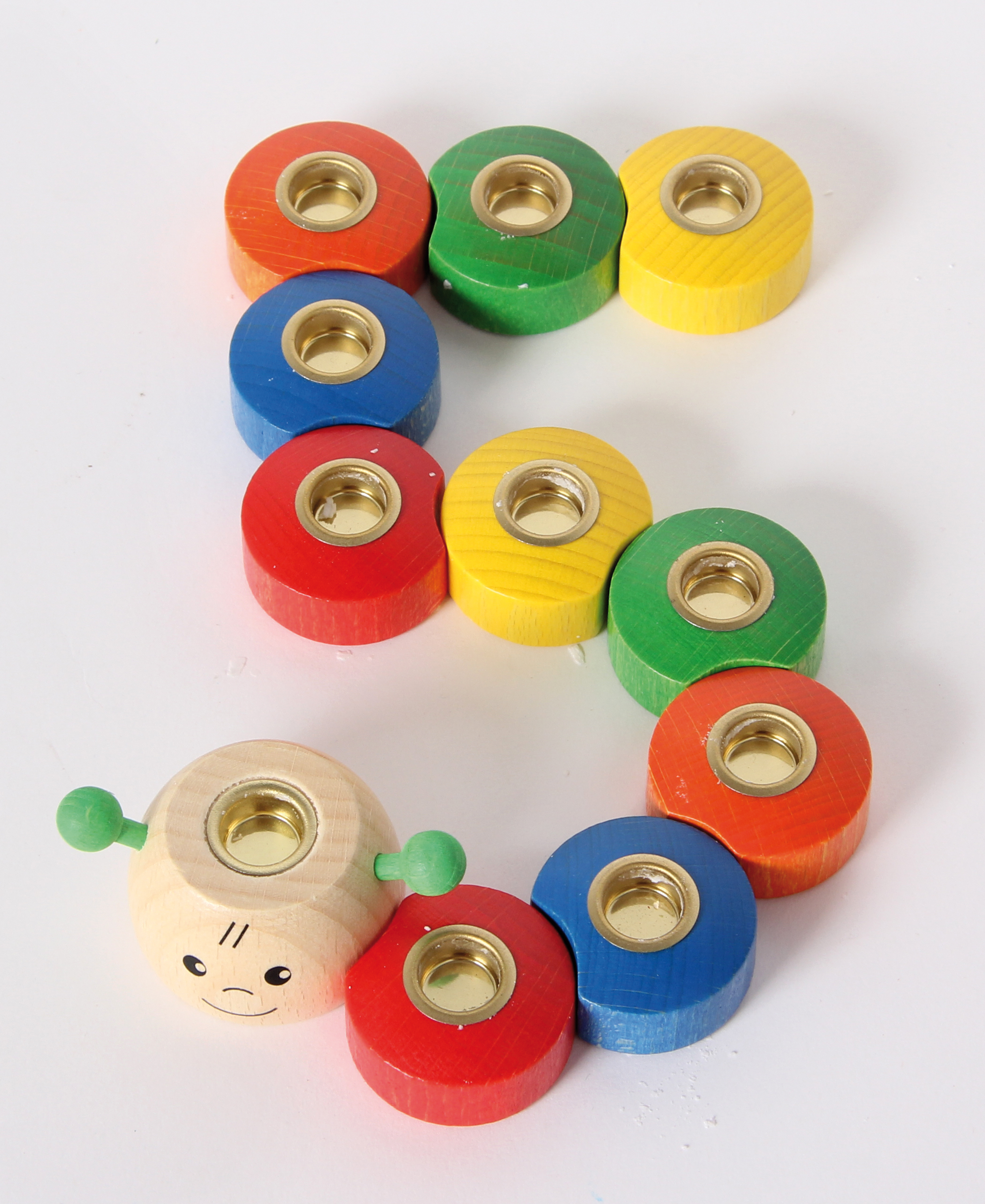 Das Set besteht aus einem Lebenslicht und zehn Geburtstagskerzen, einem Raupenkopf und zehn kleinen Kerzenständern, die Sie in beliebige Zahlen und Formen legen können.