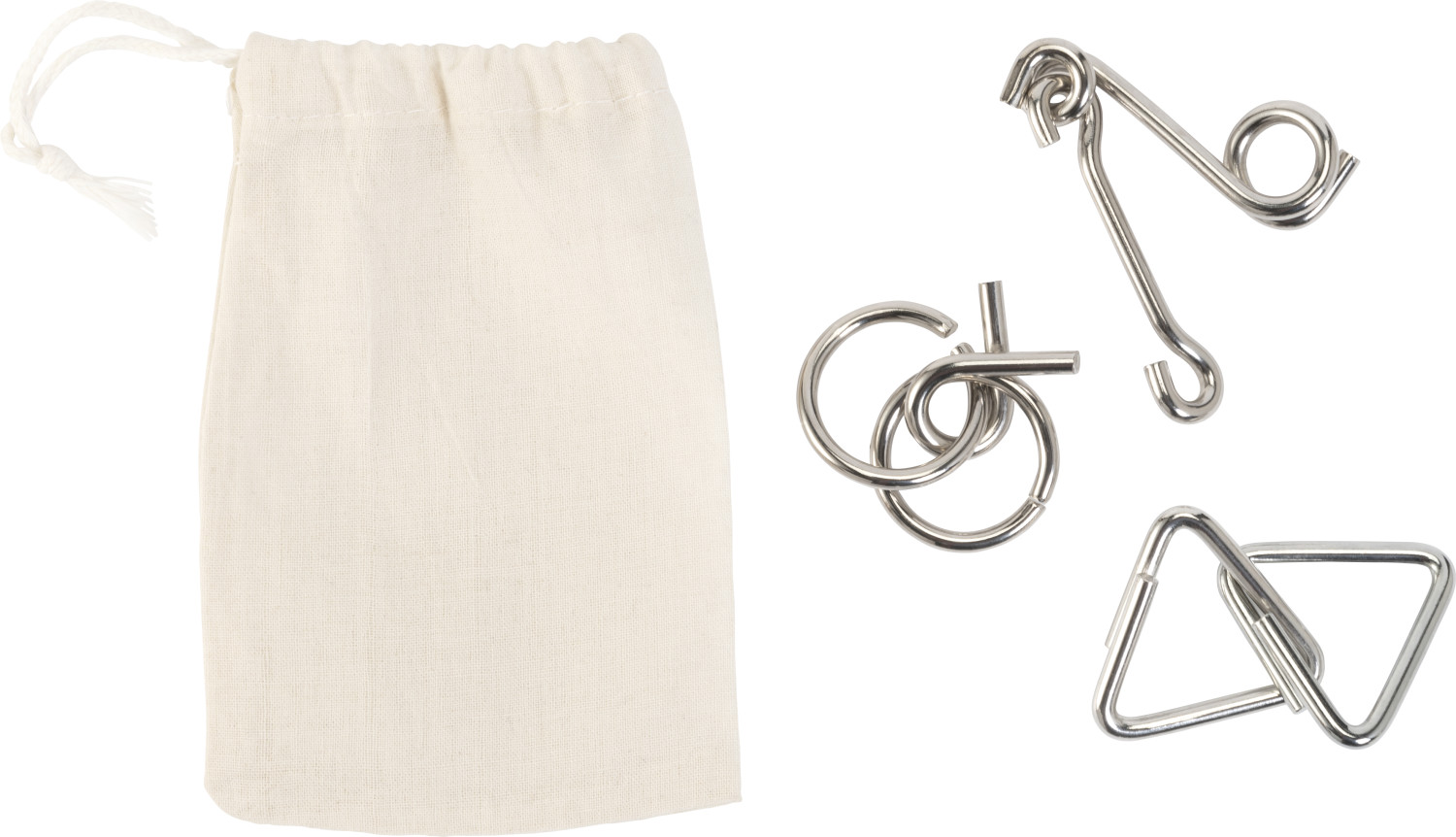 Geduldspiele-Set bestehend aus drei Spielen, verpackt in einem Baumwollbeutel mit Kordel (80 gr / m²).