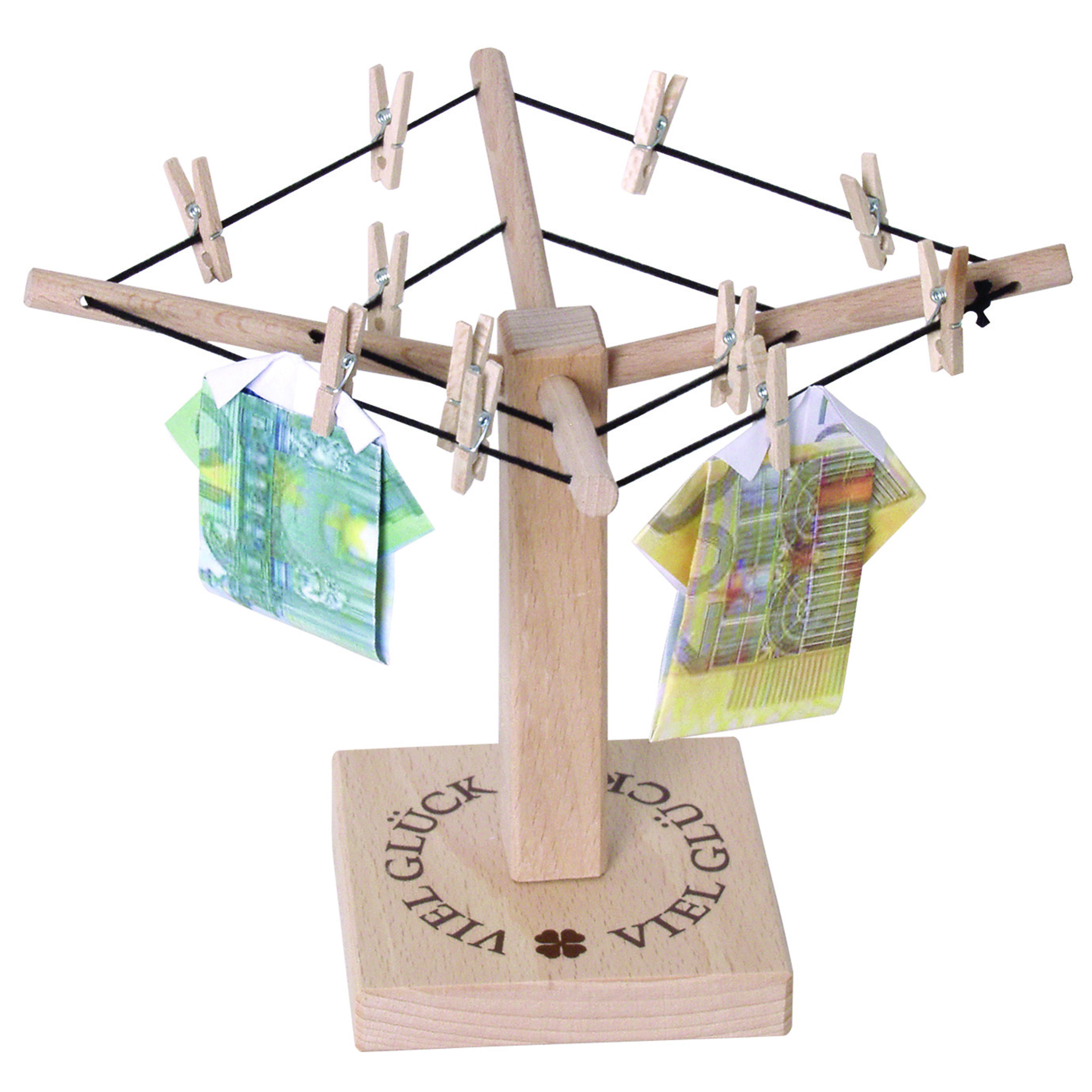 Die kleine Wäschespinne aus Holz mit Aufdruck Viel Glück! präsentiert Ihr Geldgeschenk witzig und dekorativ. Falten Sie die Geldscheine zum Hemd, zur Hose ... und hängen Sie diese mit den beiliegenden, kleinen Holz-Wäscheklammern an die Wäscheleine. Ohne Geldscheine!