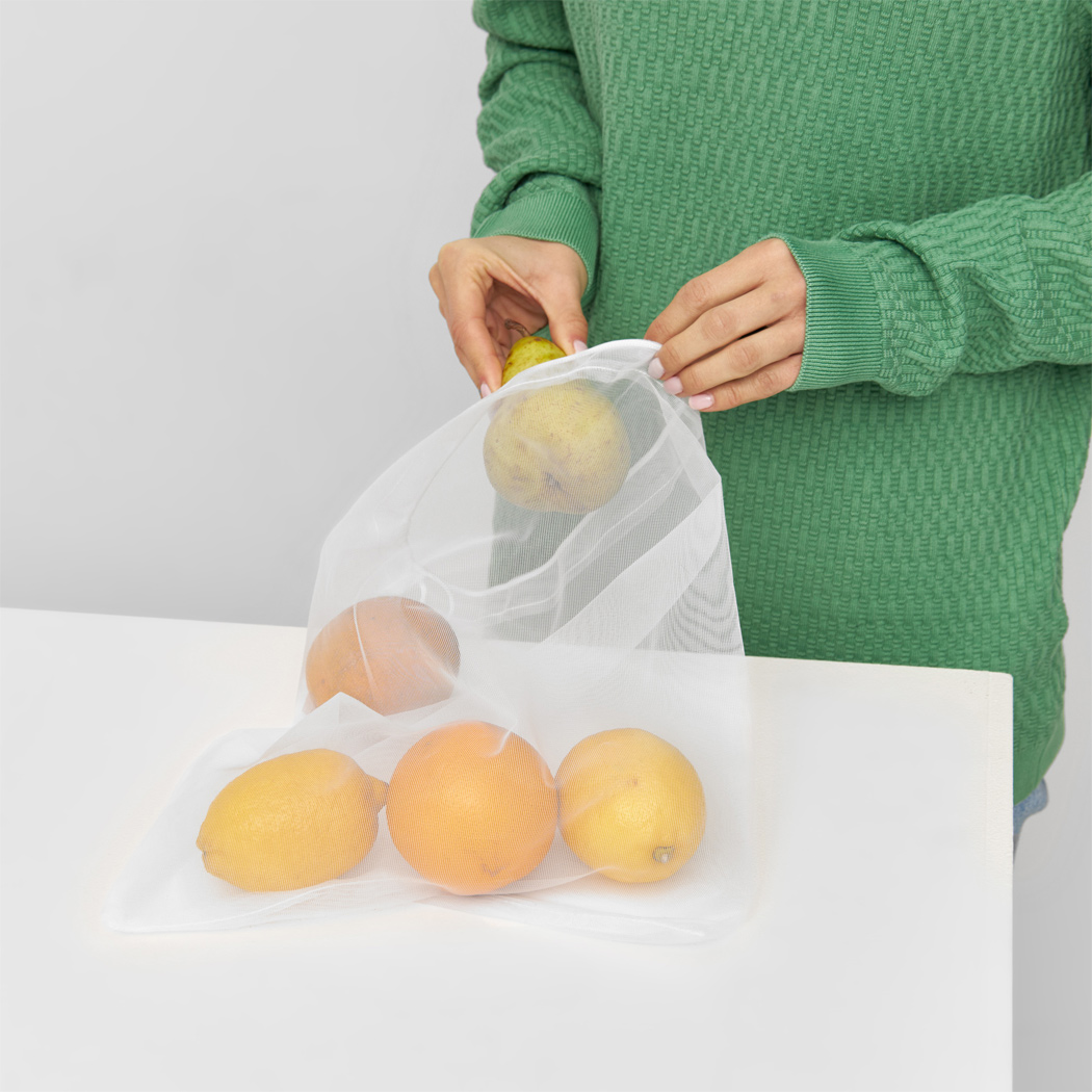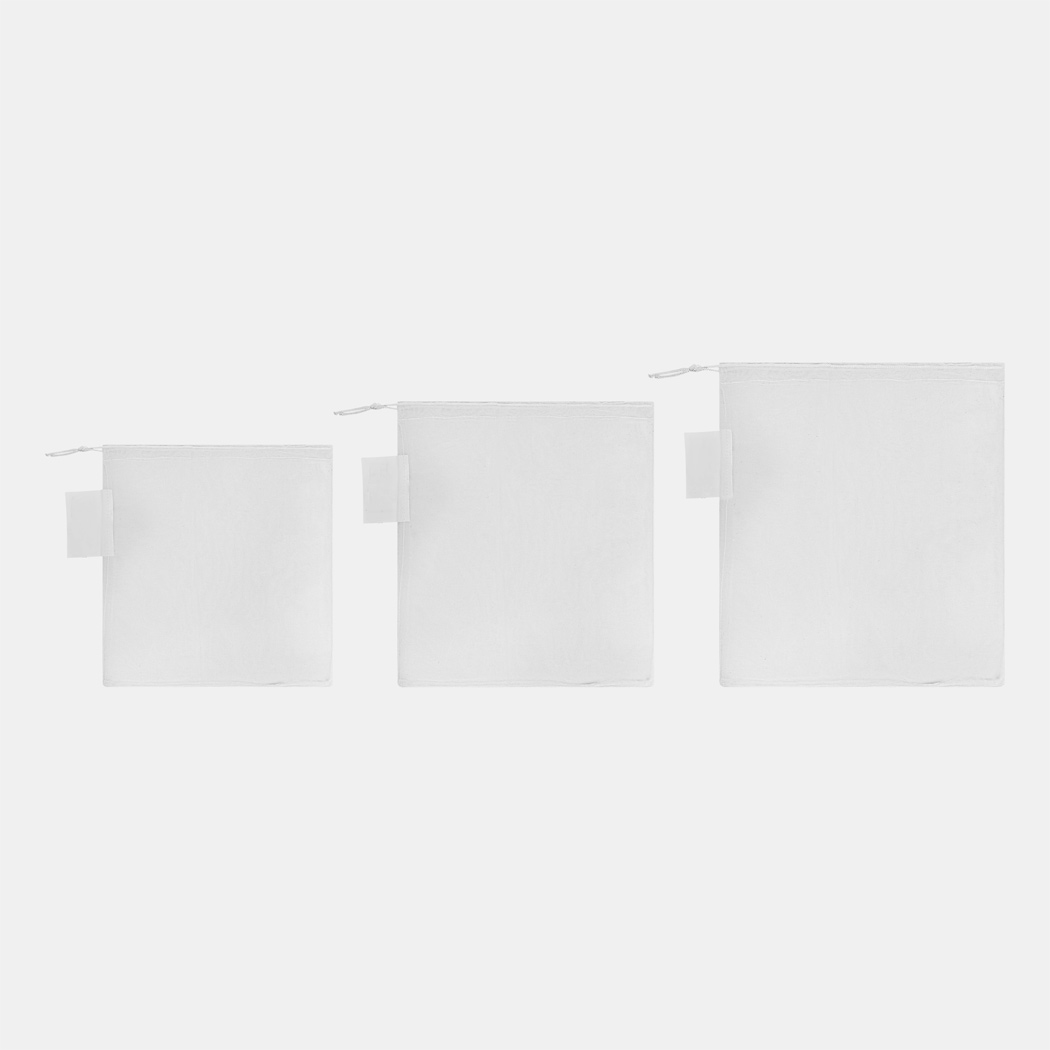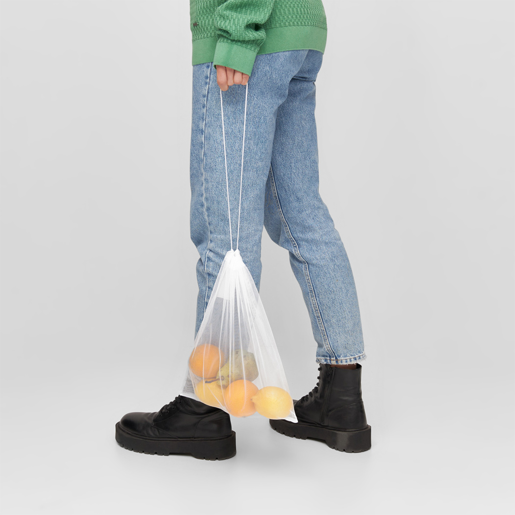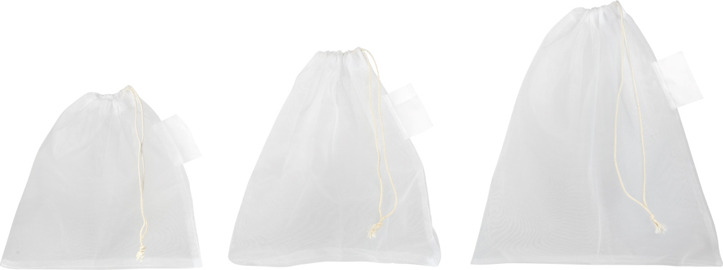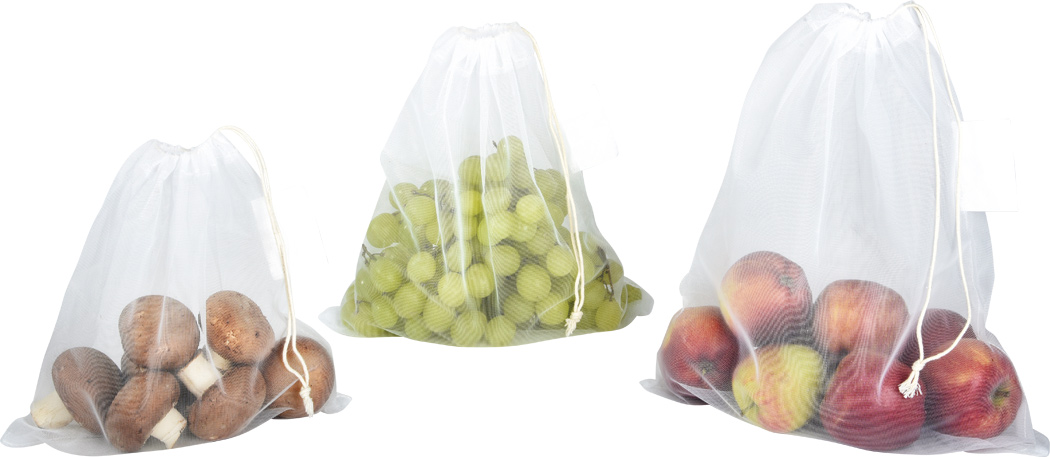 Gemüsenetz-Set BLUE PLANET SET: recyceltes Material, 3 unterschiedlich große Netze, mit Kordelzug schließbar, waschbar, wiederverwendbar, mit Etikett zur Bedruckunga