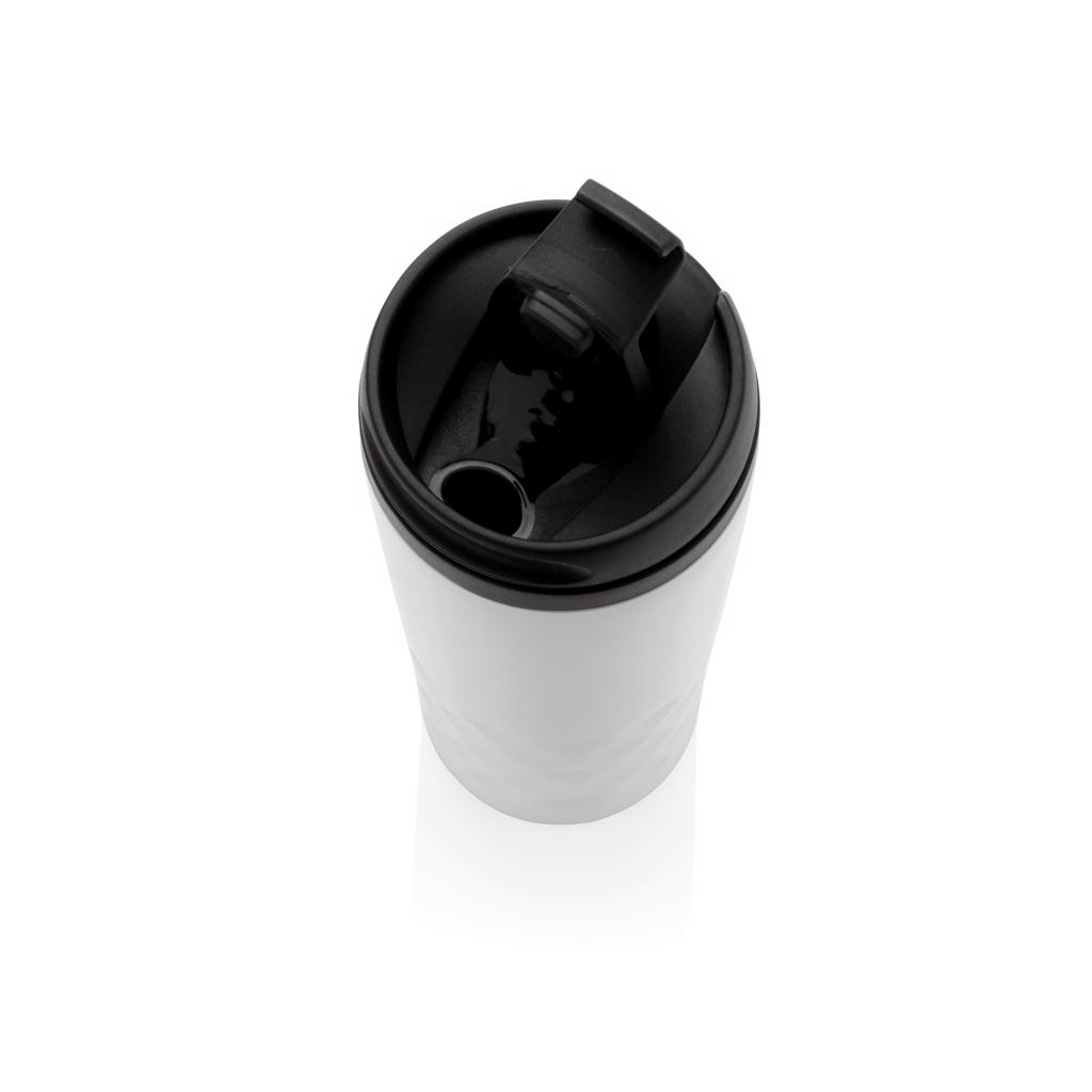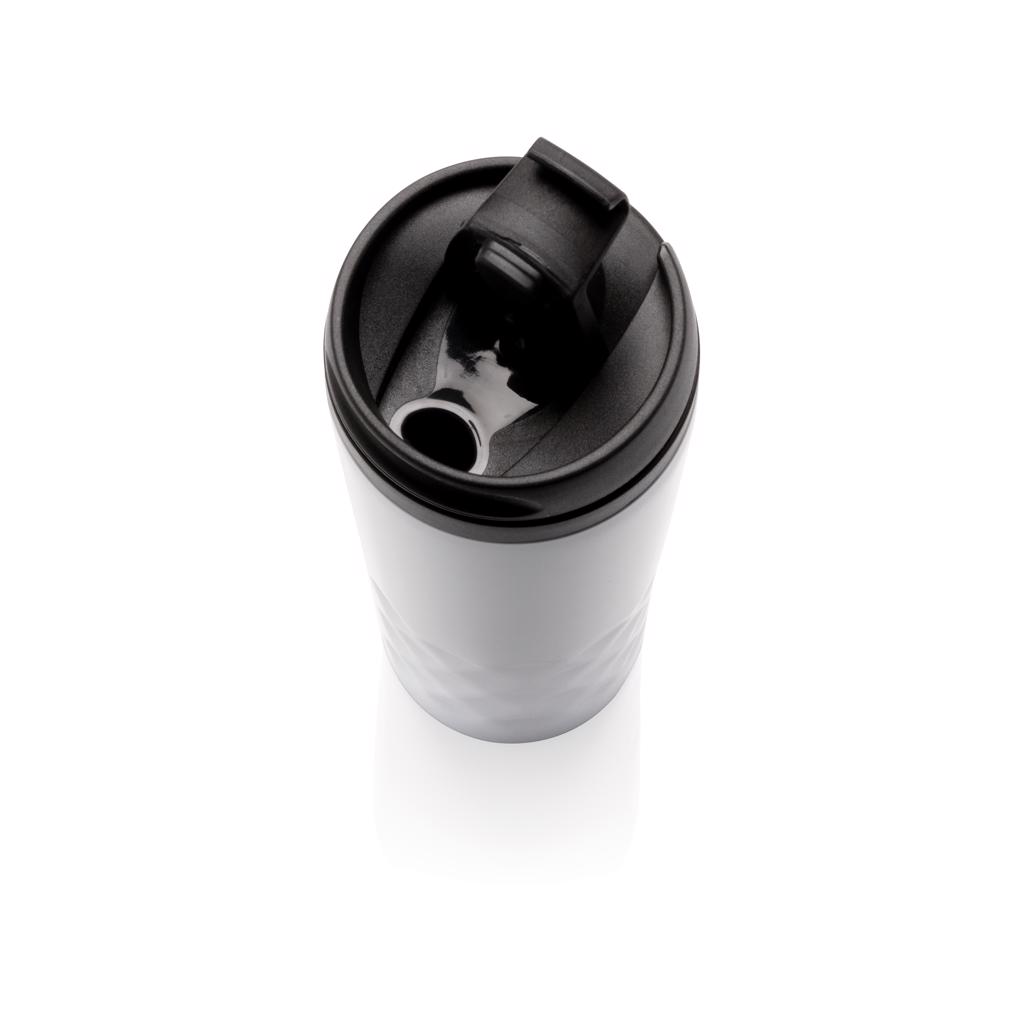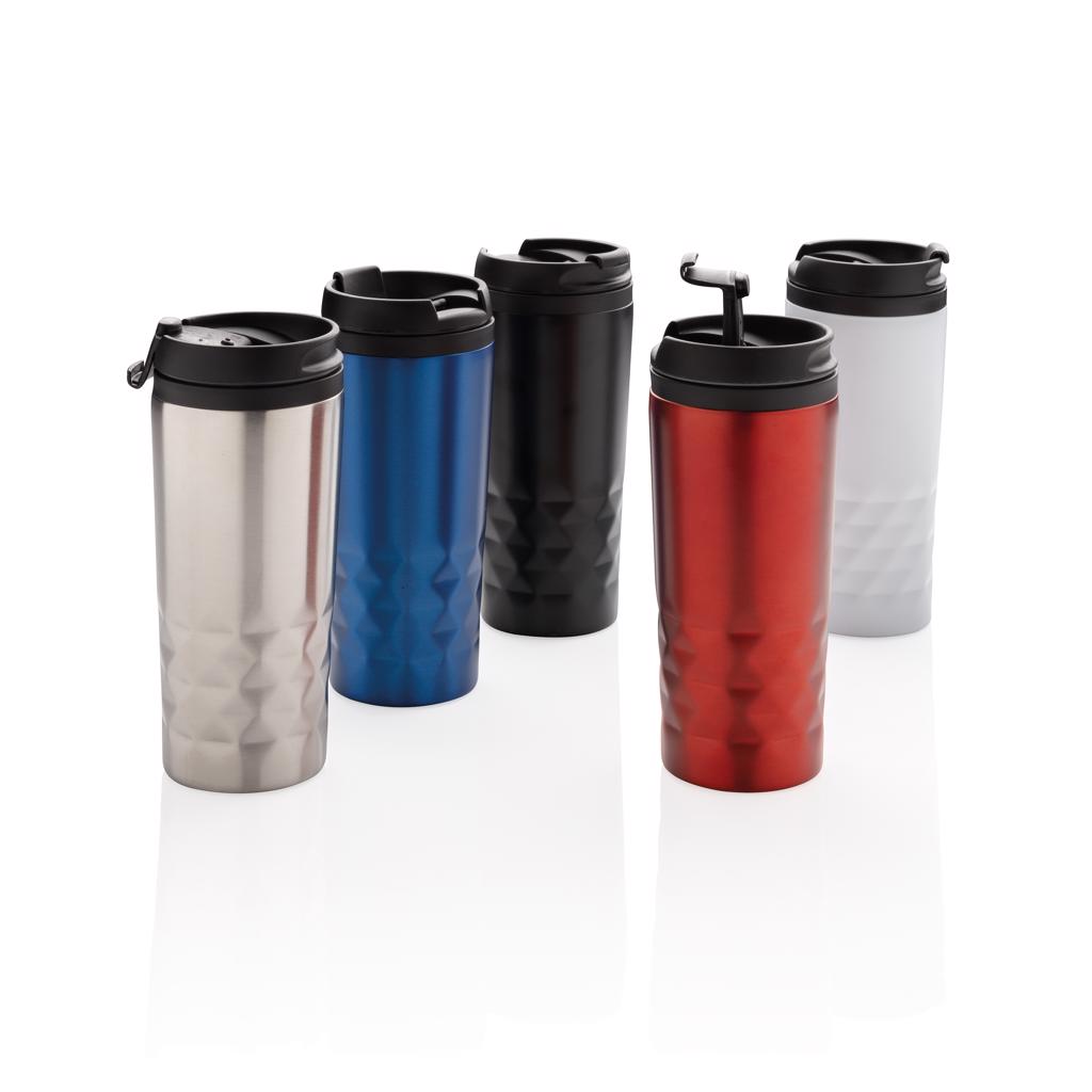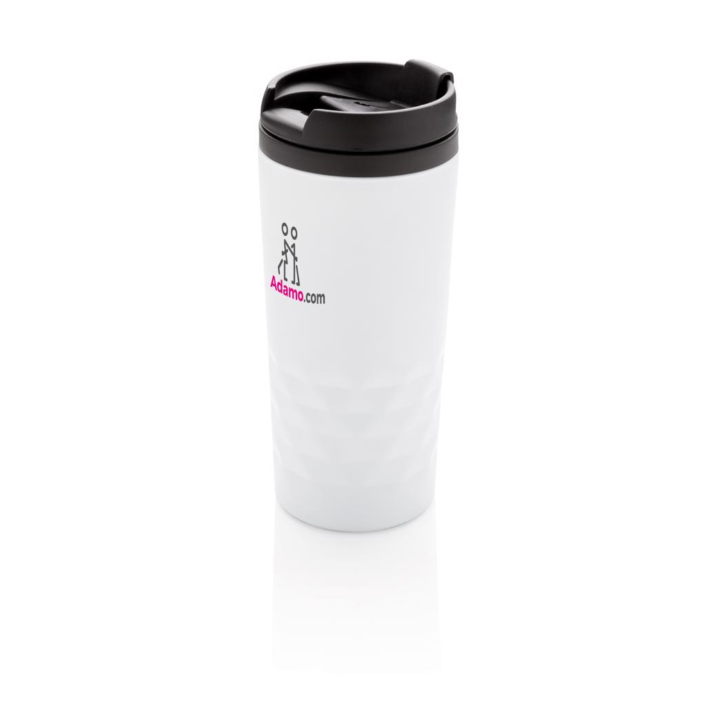 Modischer Stainless-Steel Becher mit geometrischen Details. Innen aus PP. Nur Handwäsche. Inhalt: 300ml. Nur Handwäsche.
