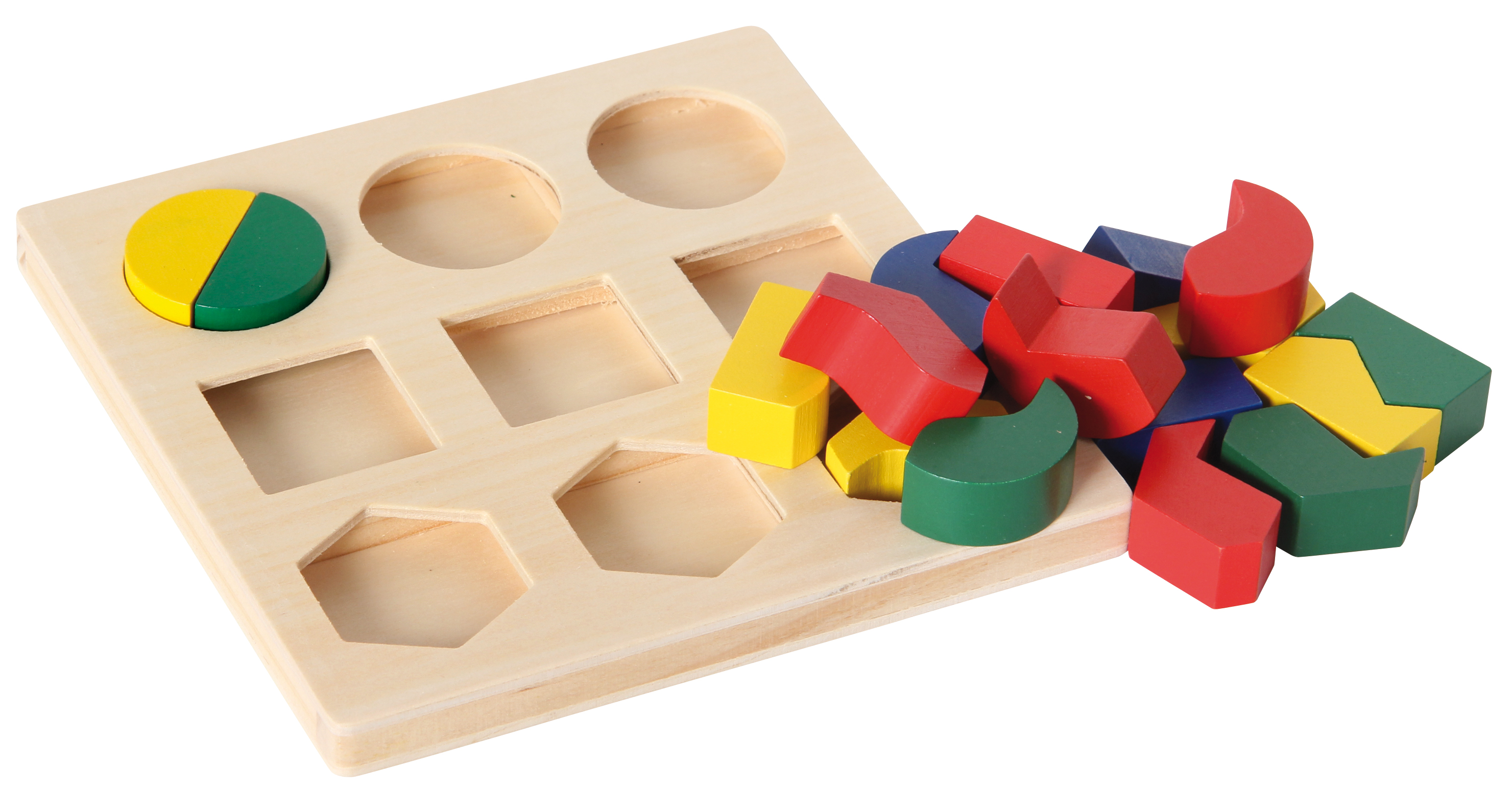 Aufgabe des 18-teiligen Holzpuzzles ist es, die zweiteiligen Bausteine richtig zusammenzufügen und in die entsprechende Mulde im Spielbrett zu legen.