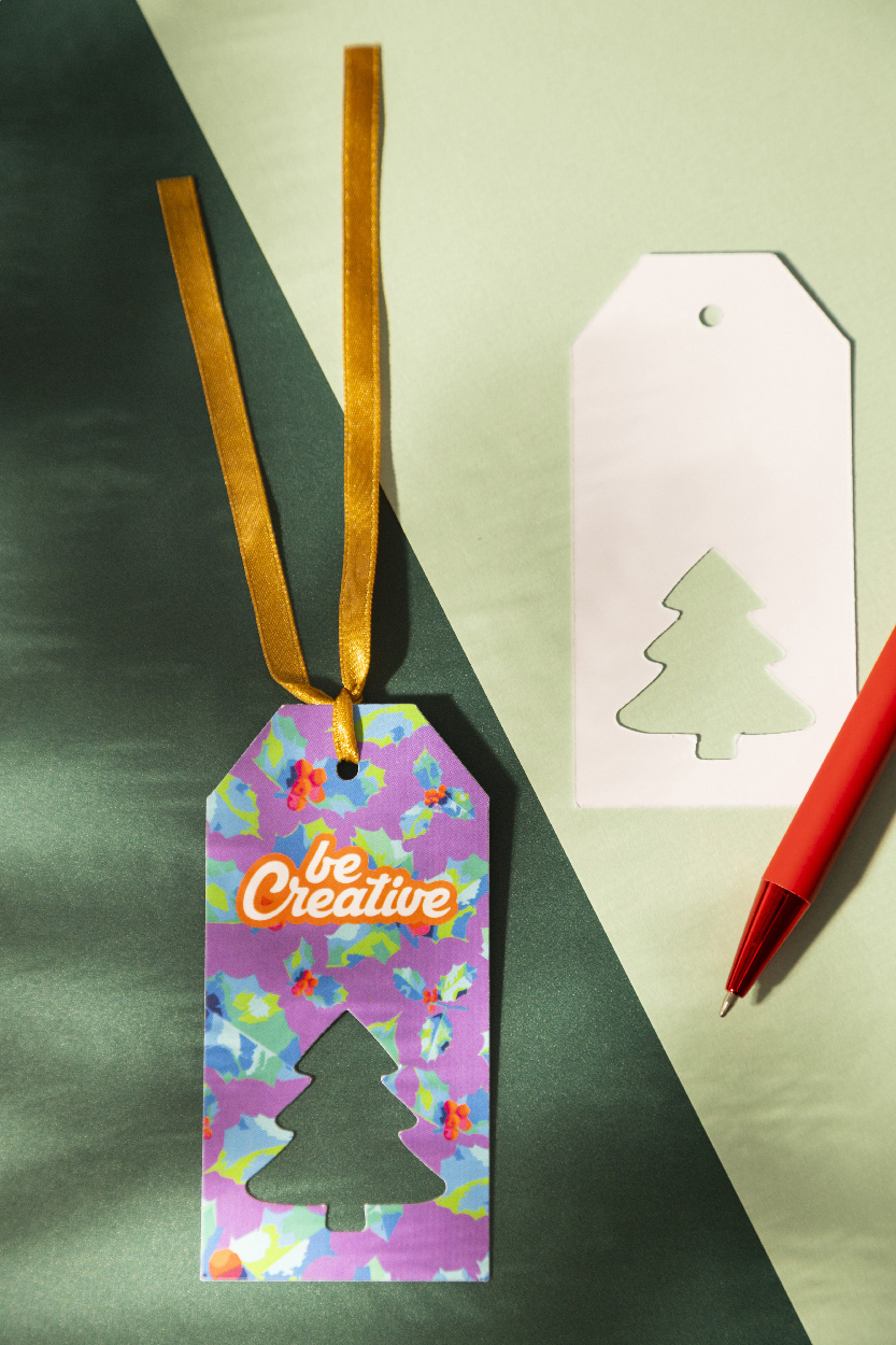 Individueller, vollfarbig bedruckter Weihnachtsgeschenkanhänger aus Papier mit gestanztem Weihnachtsmotiv und goldener Schleife. Der Preis ist inkl. einseitigem Digitaldruck. Mindestmenge: 100 Stk.