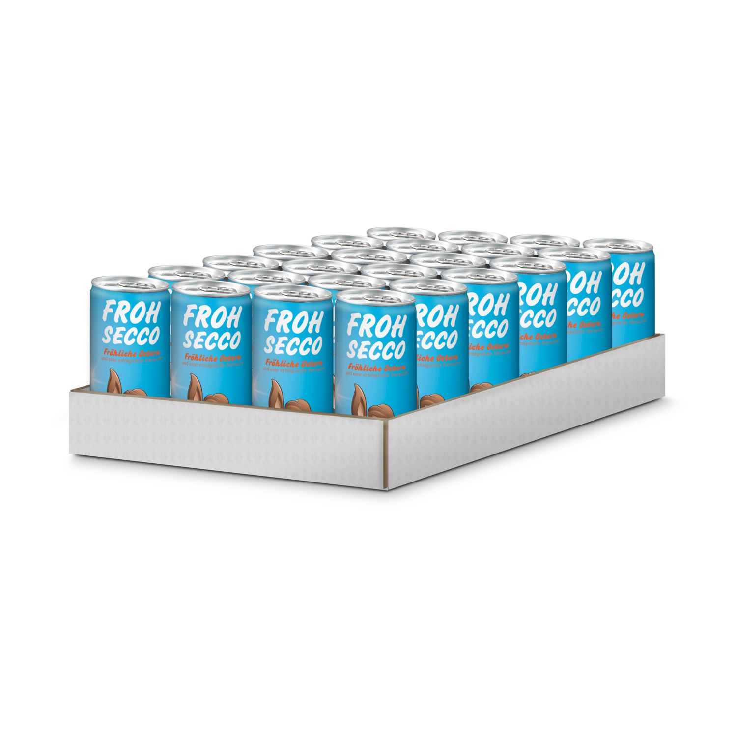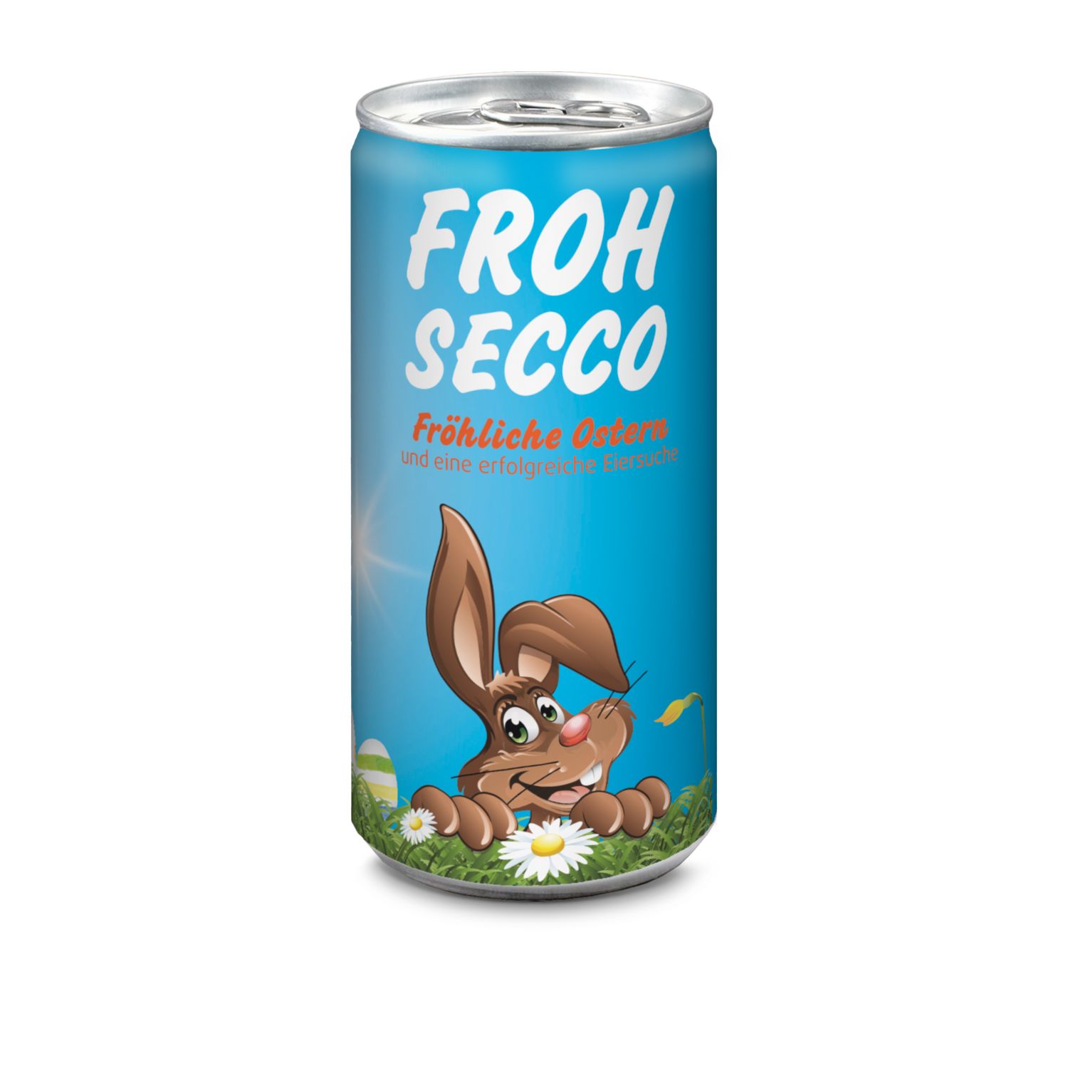 FROHSECCO - hier ist der Name Programm: 24 x 200 ml Slimline Dosen für 24 Menschen oder Tage - das bereitet auf jeden Fall Freude. Der lustige Osterhase sagt eigentlich schon alles über den spritzigen Inhalt aus. Der Secco schmeckt jedem - genießen Sie eine fröhliche Osterzeit und bereiten Sie Mitarbeitern, Kunden oder Geschäftspartnern eine prickelnde Frühlingsfreude! (Sektsteuerfrei, VE: 24 Dosen = 1 Tray); inklusive 6,00 € Pfand in Deutschland (0,25 € pro Dose).