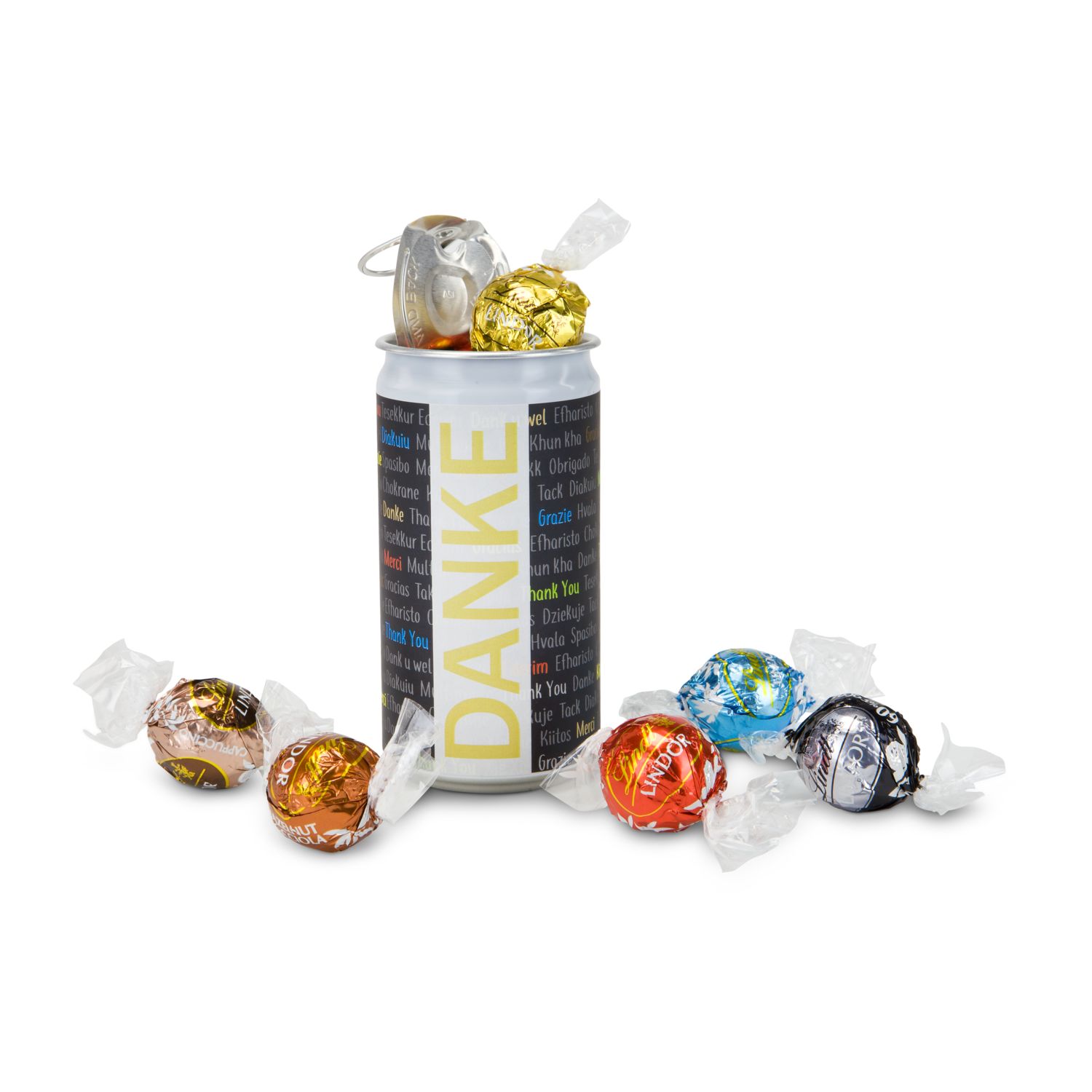 Eine Überraschungsdose für liebe Menschen, denen Sie einfach mal DANKE sagen möchten: Fünf verschiedene Lindt-Lindorkugeln (je 12,5 g) in den Geschmacksrichtungen Vollmilch, Weiße Schokolade, Stracciatella, Zartbitter und Haselnuss rascheln geheimnisvoll in einer verschlossenen Dose mit "Danke”-Etikett. Wer den Deckel öffnet, wird sich garantiert über den süßen Inhalt und die nette Geste freuen. Erhältlich mit verschiedenen Oster-Botschaften. Natürlich können wir die Dosen auch mit Ihrem eigenen Motiv ausstatten. Fragen Sie uns dazu an!