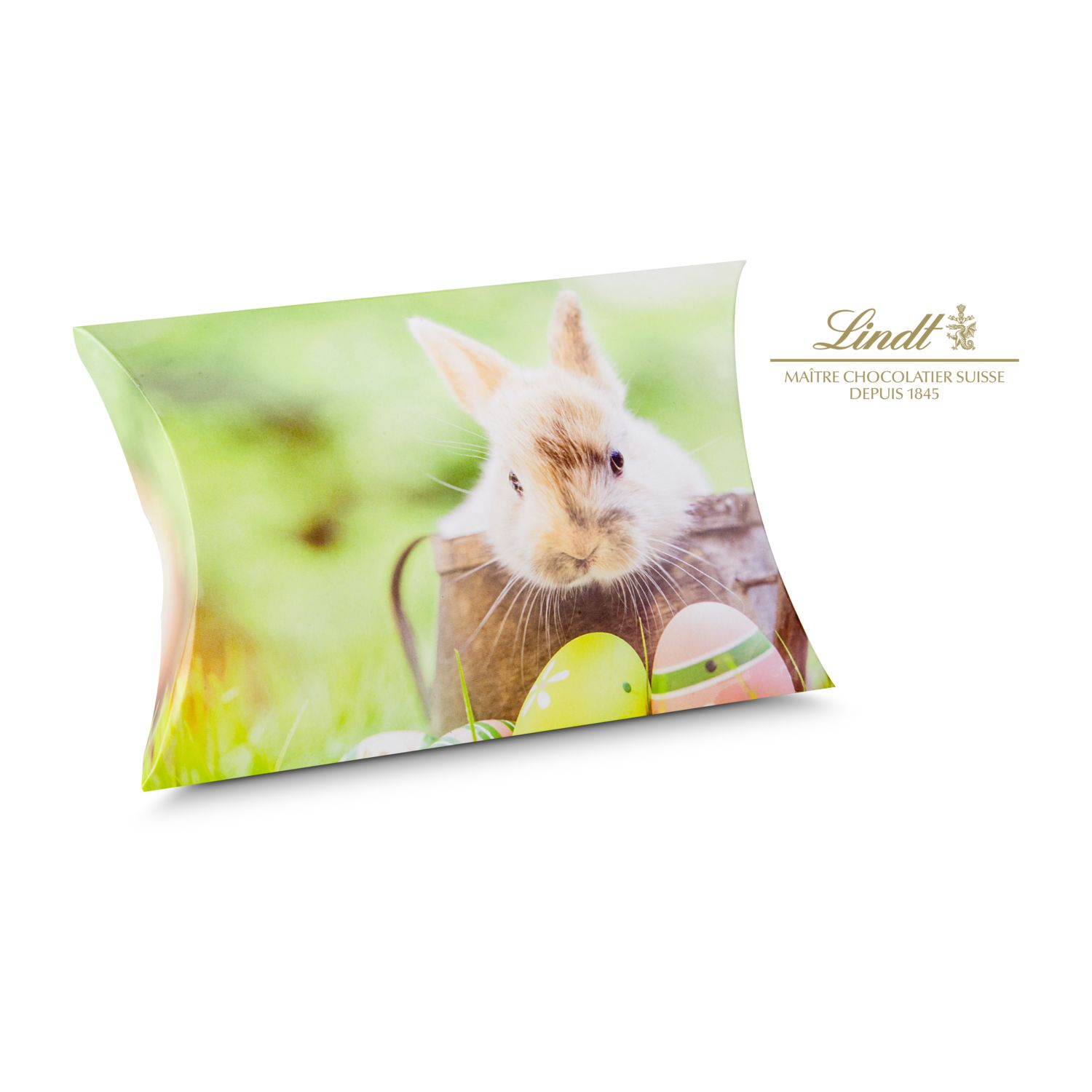 Dieses kleine originelle Osternest kommt in einer Kissenverpackung, auf Wunsch individuell bedruckt mit Ihrem Design. Im "Nest" sitzt 1 Lindt-Goldhase (10 g) umgeben von 5 gewickelten Lindor-Mini-Eiern (je 4,6 g) in verschiedenen Sorten auf frischem, grünen Sizzle. Wählen Sie zwischen der Standardverpackung ab 1 Stück oder einer individuellen Gestaltung.