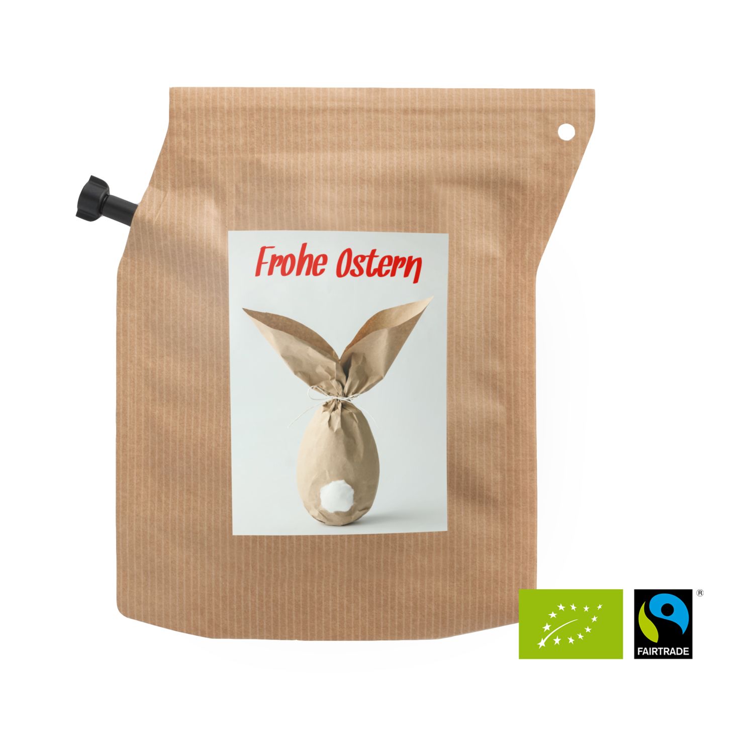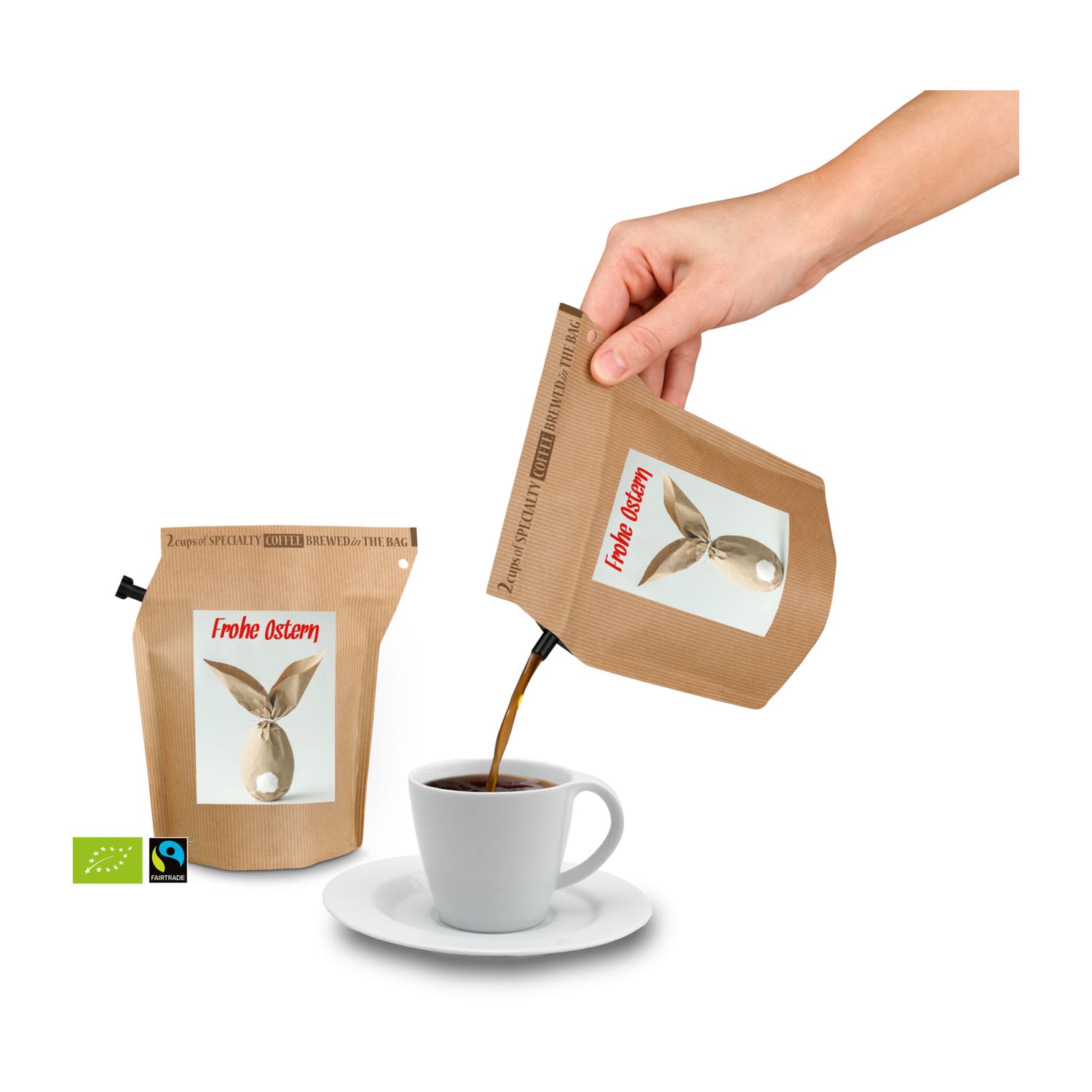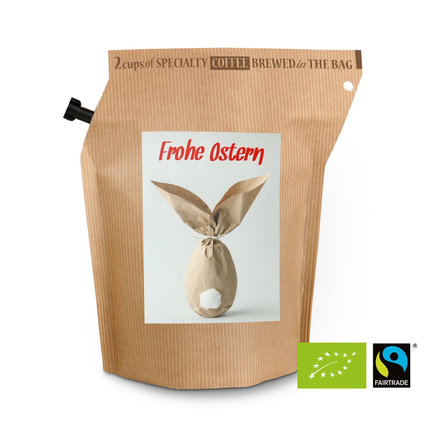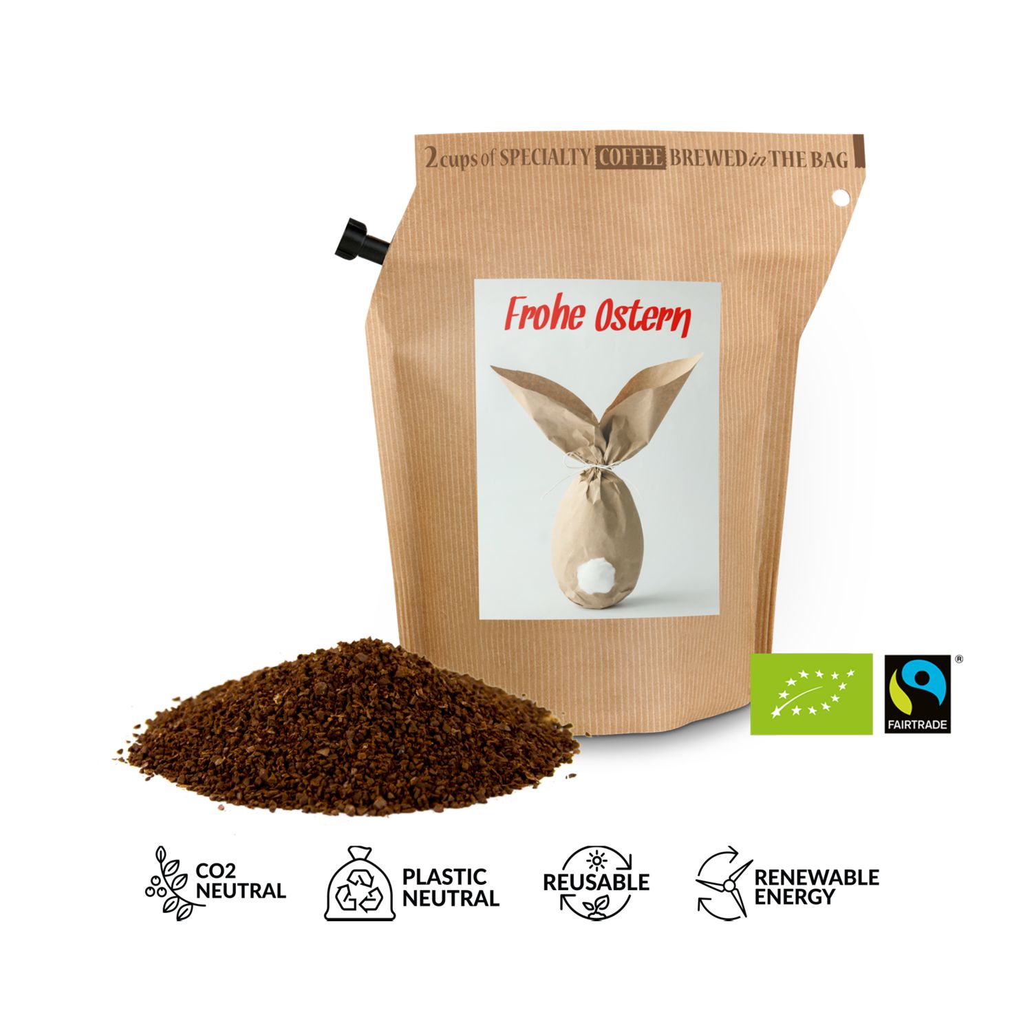 Verschenken Sie Fröhlichkeit und Genuss zur Osterzeit: kleines Präsent, große Wirkung - und das im Frühling! Mit diesen hübschen Brühbeuteln mit fairtrade Bohnen aus Honduras lässt sich die Hektik des Alltags schnell vergessen. Einfach heißes Wasser einfüllen, ziehen lassen, durch den integrierten Filter ausgießen und genießen. Kein Instant-Produkt! Pure Osterfreude. Ideal auch für das Büro oder für unterwegs. Ein Beutel ergibt zwei Tassen und kann wiederverwendet werden. Erhältlich mit 5 verschiedenen Oster-Aufklebern. Herstellung 100% CO2 neutral (WeForest validiertes Baumpflanzungs-Projekt + UN kontrolliertes REED Kohlenstoffkompensationsprojekt) und Plastik neutral (Plastic Bank® zertifizierter Ausgleich durch das Sammeln von im Meer befindlichem Plastik) und mit Windenergie.