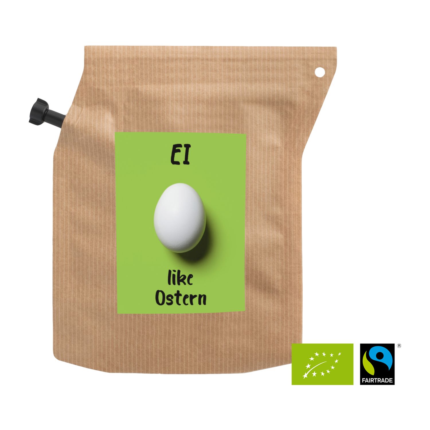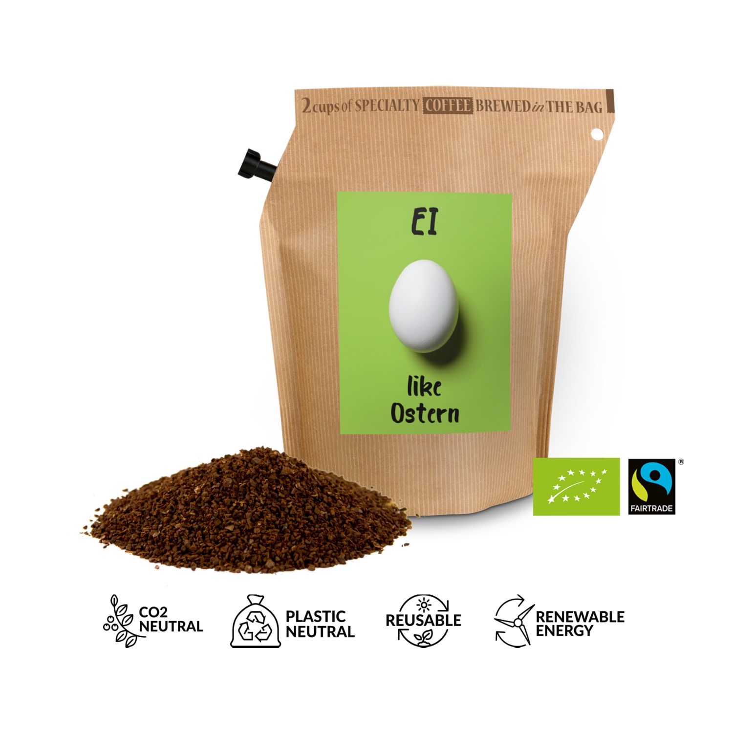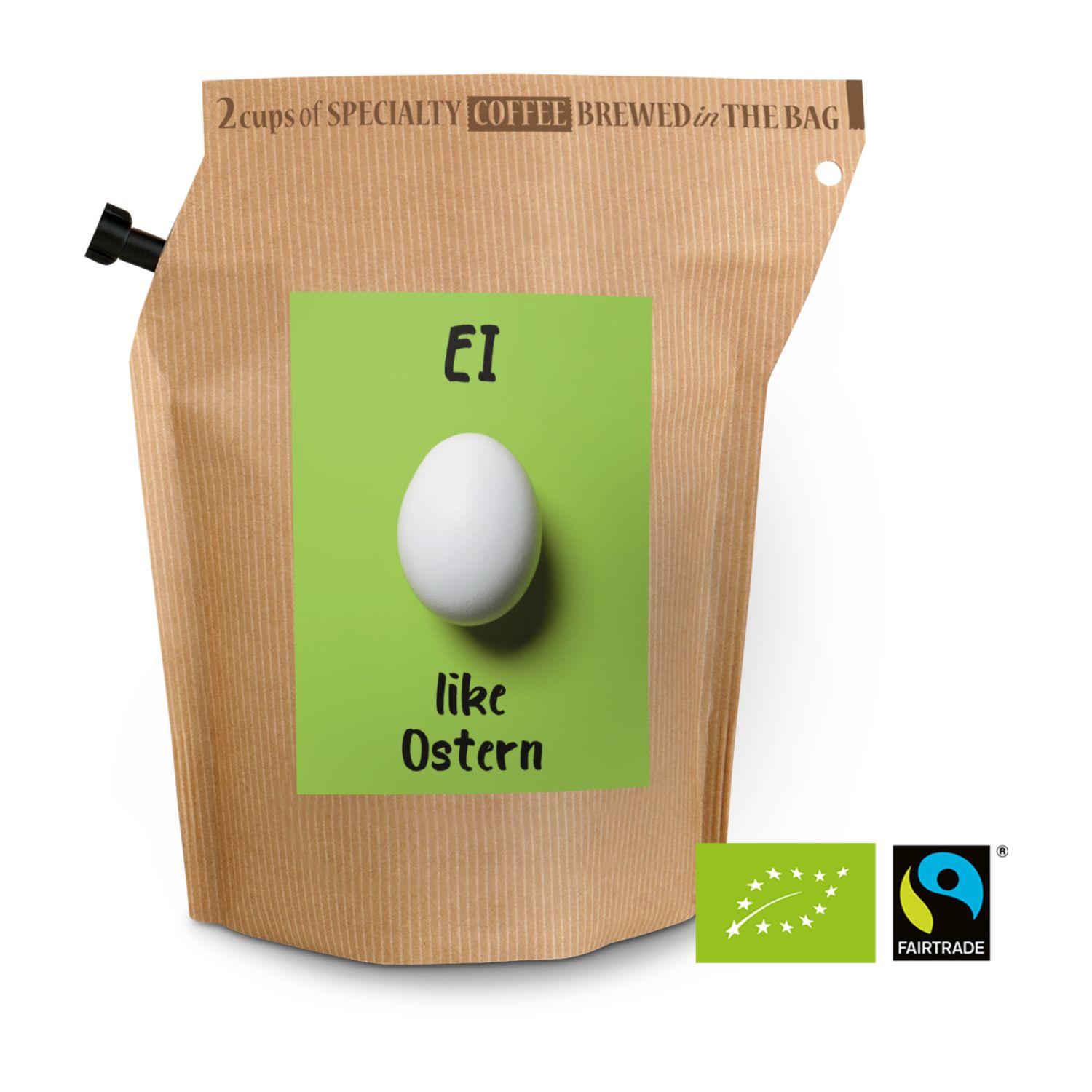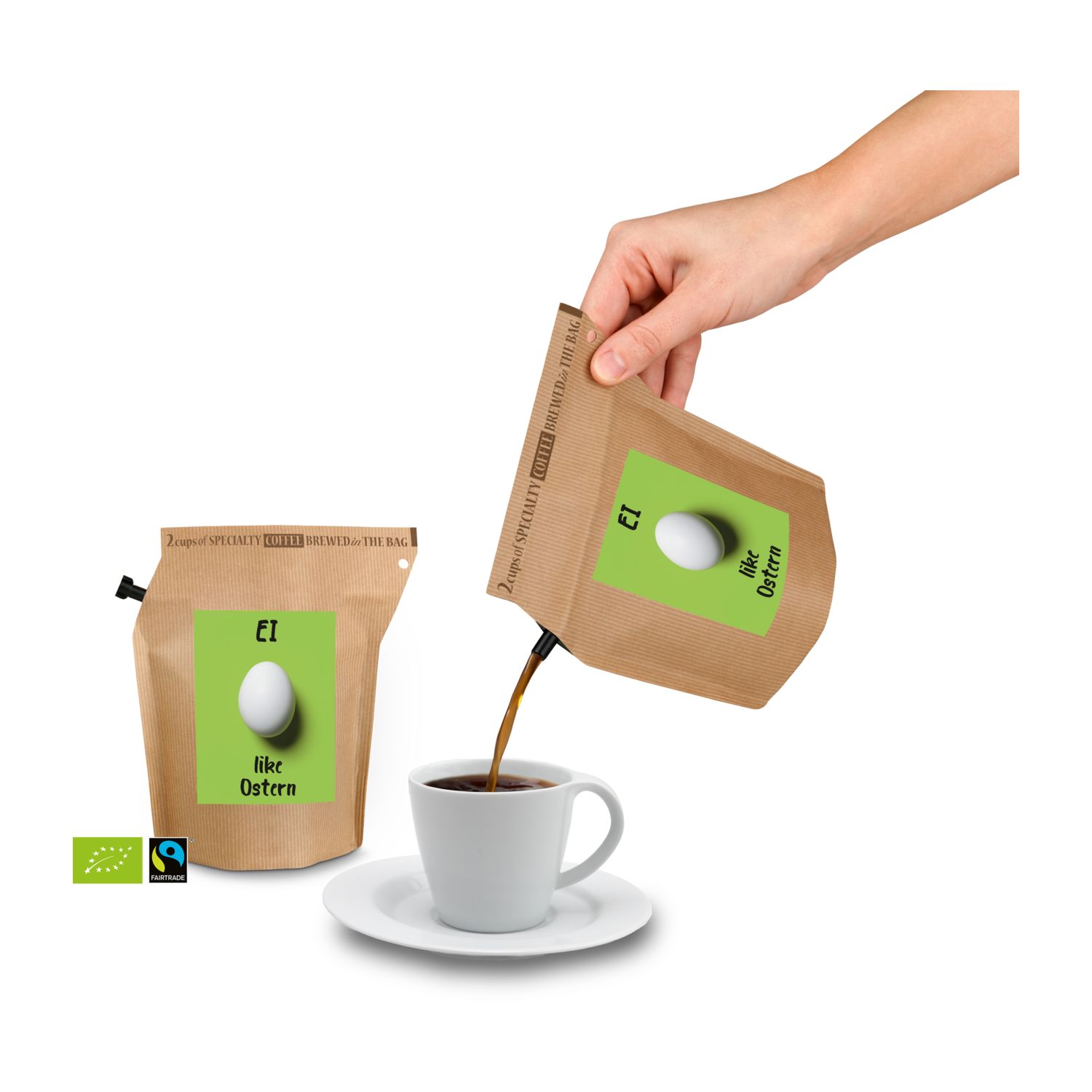 Verschenken Sie Fröhlichkeit und Genuss zur Osterzeit: kleines Präsent, große Wirkung - und das im Frühling! Mit diesen hübschen Brühbeuteln mit fairtrade Bohnen aus Honduras lässt sich die Hektik des Alltags schnell vergessen. Einfach heißes Wasser einfüllen, ziehen lassen, durch den integrierten Filter ausgießen und genießen. Kein Instant-Produkt! Pure Osterfreude. Ideal auch für das Büro oder für unterwegs. Ein Beutel ergibt zwei Tassen und kann wiederverwendet werden. Erhältlich mit 5 verschiedenen Oster-Aufklebern. Herstellung 100% CO2 neutral (WeForest validiertes Baumpflanzungs-Projekt + UN kontrolliertes REED Kohlenstoffkompensationsprojekt) und Plastik neutral (Plastic Bank® zertifizierter Ausgleich durch das Sammeln von im Meer befindlichem Plastik) und mit Windenergie.