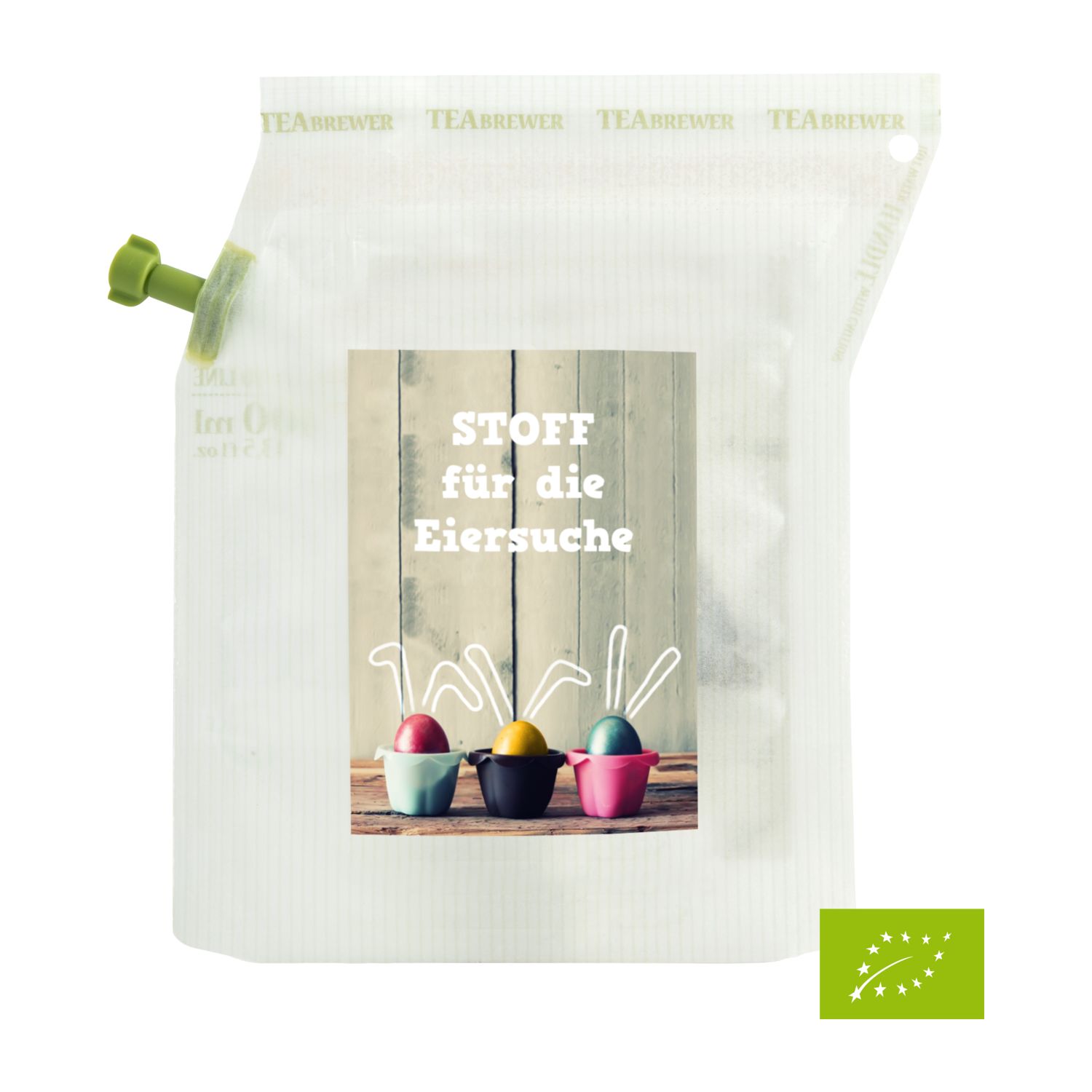 Verschenken Sie Fröhlichkeit und Genuss zur Osterzeit: kleines Präsent, große Wirkung - und das im Frühling! Mit diesen hübschen Brühbeuteln lässt sich die Hektik des Alltags schnell vergessen. Einfach heißes Wasser einfüllen, ziehen lassen, durch den integrierten Filter ausgießen und genießen. Kein Instant-Produkt! Pure Osterfreude. Ideal auch für das Büro oder für unterwegs. Ein Beutel ergibt zwei Tassen und kann wiederverwendet werden. Erhältlich mit 6 verschiedenen Oster-Aufklebern. Herstellung 100% CO2 neutral (WeForest validiertes Baumpflanzungs-Projekt + UN kontrolliertes REED Kohlenstoffkompensationsprojekt) und Plastik neutral (Plastic Bank® zertifizierter Ausgleich durch das Sammeln von im Meer befindlichem Plastik) und mit Windenergie.