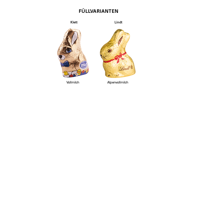 Kleine Werbebox aus weißem Karton, Verschluss mit aufgestellten Hasenohren, Box individuell bedruckt. Andere Aufstellformen und Füllvarianten auf Anfrage. Saisonartikel - solange Vorrat reicht. Inhalt: 1 Klett Osterhase aus Vollmilchschokolade, 12,5 g. Saisonartikel - solange der Vorrat reicht!