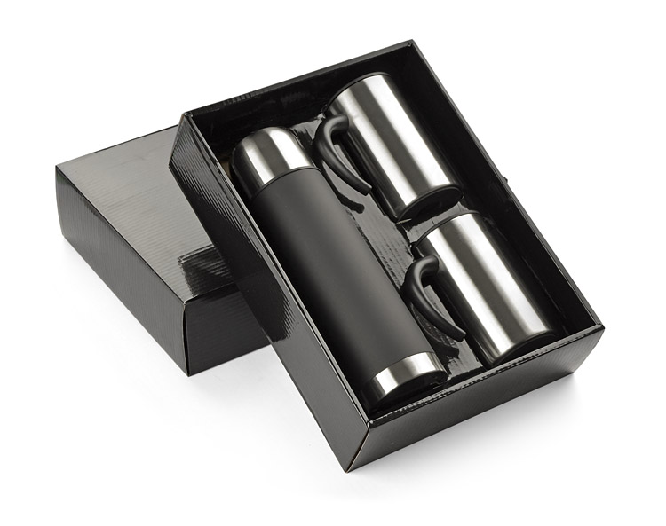 Thermosflasche aus Edelstahl 500ml und 2 Thermobecher 260ml. Das Logo wird auf der Thermosflasche und den Thermobechern graviert. Notwendig in jeder Reise. Gepackt in eine schwarze Box.