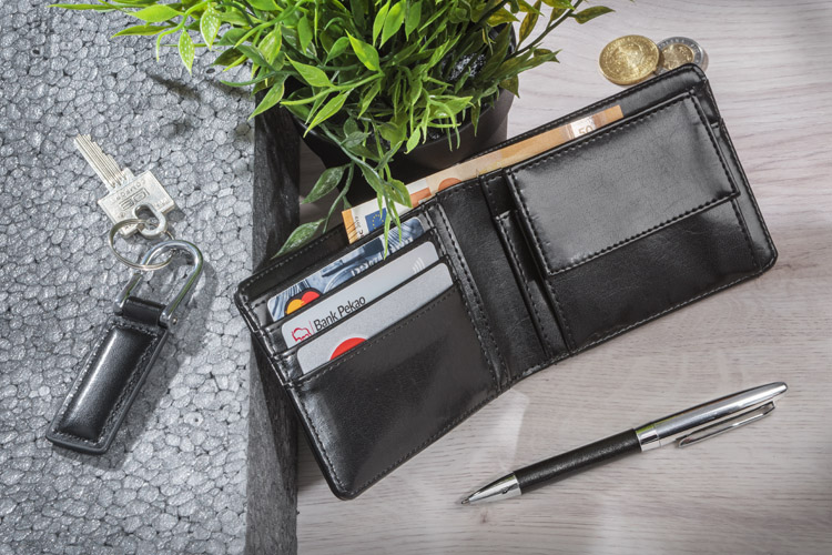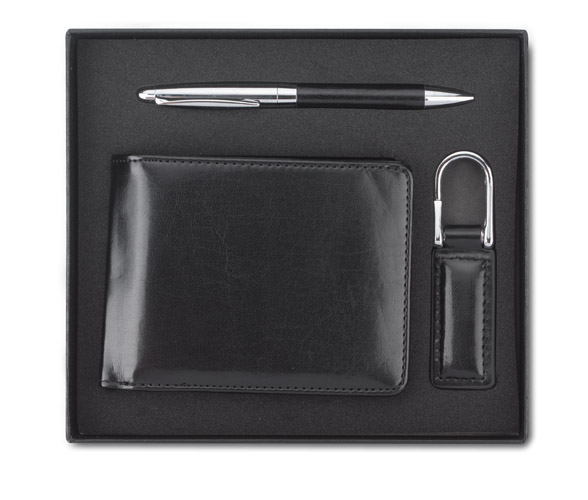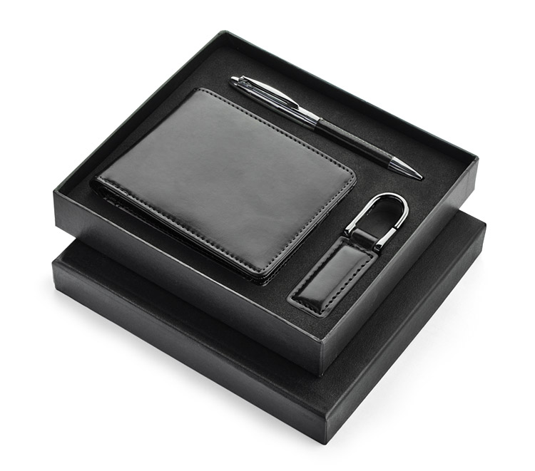 Das Geschenkset besteht aus einem Geldbeutel, einem Schlüsselanhänger und einem Metallkugelschreiber. Der Geldbeutel ist aus Öko-Leder gefertigt und enthält 2 Geldscheinfächer, ein Fach für Münzen und zusätzliche Fächer für z. B. Kreditkarten oder Quittungen. Alle Elemente sind in einer stilvollen schwarzen Schachtel verpackt. Wir können ein Logo auf jedes einzelne Element sowie auf die Box gravieren. Produktabmessungen: 115 x 91 x 15 mm (Geldbörse), 133 x ⌀10 mm (Stift), 65 x 25 x 5 mm (Schlüsselanhänger), 181 x 163 x 31 mm (Verpackung).