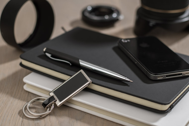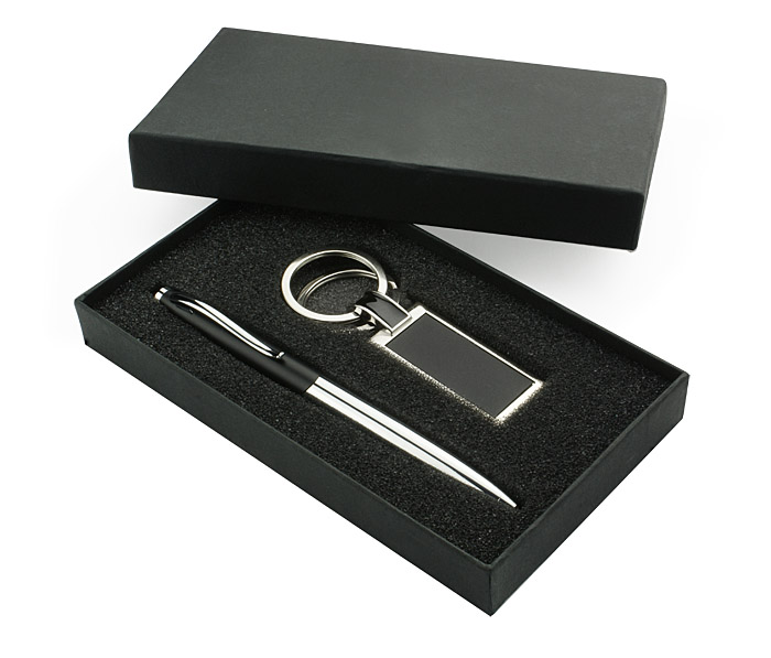 Geschenkset: Kugelschreiber und Schlüsselanhänger mit 2 Ringen. Schreibfarbe - schwarz. Gepackt in eine schwarze Box. Das Logo wird auf dem Kugelschreiben graviert.