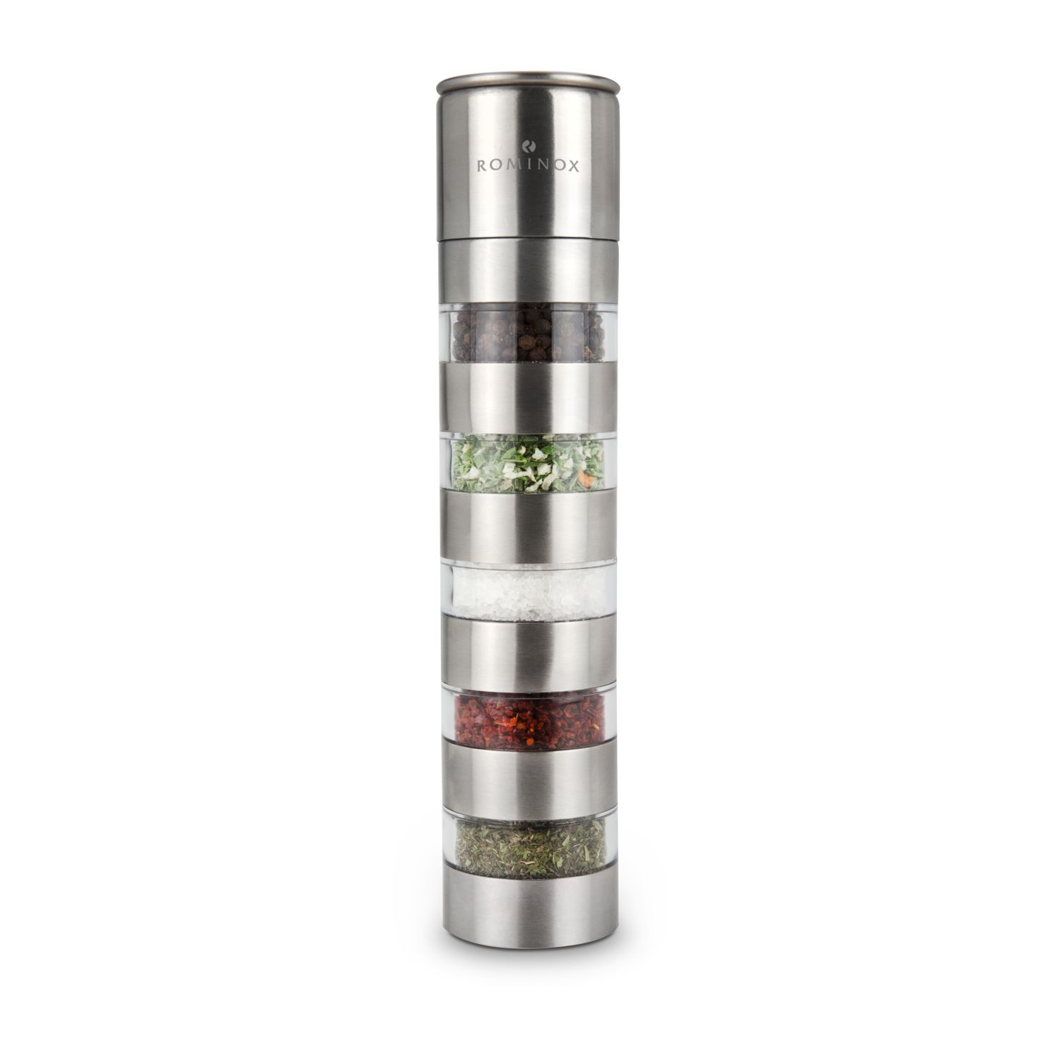Diese clevere Gewürzmühle mit Keramikmahlwerk von ROMINOX® bietet Platz für 5 verschiedene Gewürze - die Erstausstattung ist gleich mit im Set: ca. 10 g Toskana Mischung, 7 g italienische Kräuter, 15 g geschrotete Chili Schoten, 40 g Salz, 20 g Pfefferkörner. Alles ist verpackt im schwarzen Geschenkkarton, inkl. Einleger mit Beschreibung der Mühle. Viel Spaß beim Würzen!