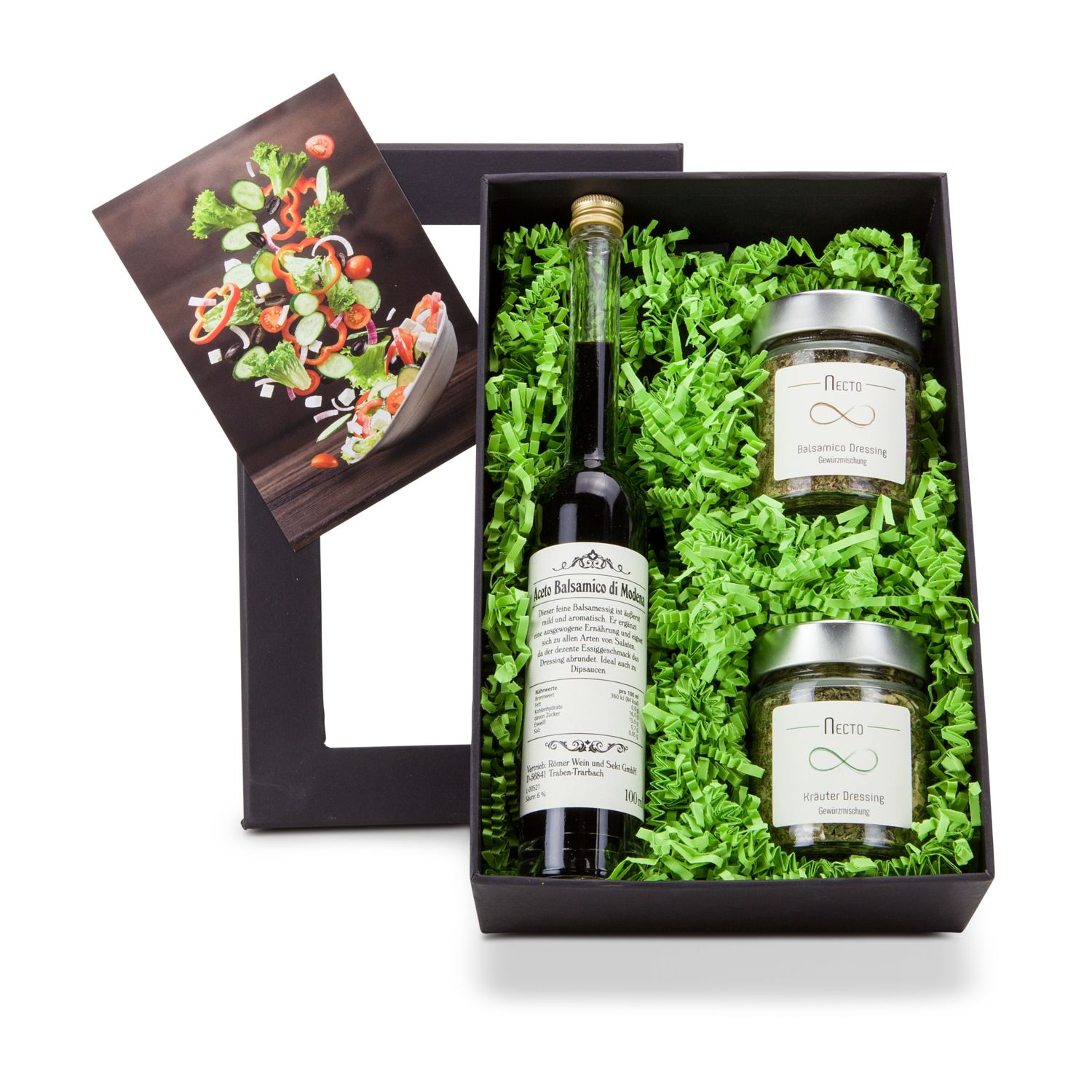 Eine Salat-Beilage passt eigentlich immer! Würzen Sie nach Herzenslust (oder nach Anleitung des Rezeptflyers) mit einer Flasche Aceto Balsamico (0,1 l), einer Gewürzmischung für Kräuter Dressing (30 g) und einer Gewürzmischung für Balsamico Dressing (60 g). Alles kommt in einem schwarzen Geschenkkarton mit passendem Deckelaufkleber und frisch-grünem Sizzle.