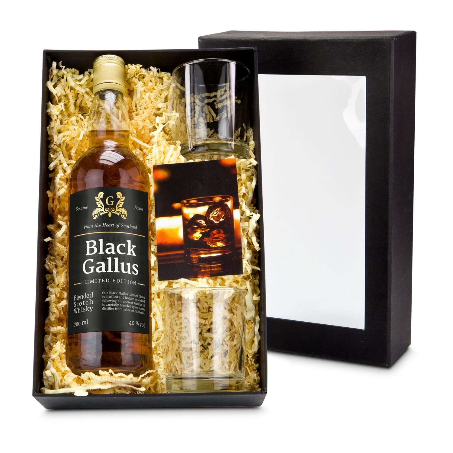 Exklusiver Whisky - so kann ein Abend gut beginnen! Die Black Gallus Limited Edition (0, 7 l, 40 % Vol.) kommt aus dem Herzen Schottlands und wird in limitierter Auflage nach alter Tradition destilliert und abgefüllt. Den edlen Tropfen haben wir kombiniert mit 2 Whiskygläsern und einem stimmungsvollen Info-Kärtchen. Ein geschmackvolles Präsent - vielleicht auch für sich selbst!