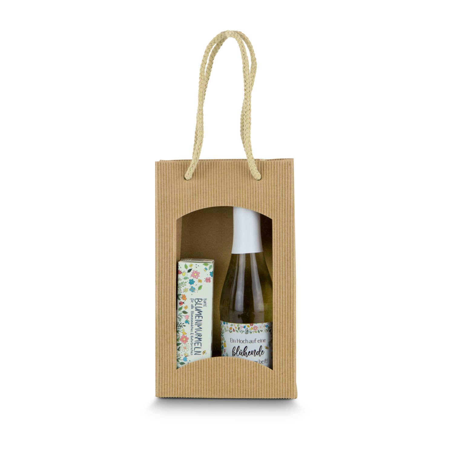 Stoßen Sie im wahrsten Sinne des Wortes auf eine blühende Zusammenarbeit an und unterstreichen Sie Ihre Verbundenheit mit der Natur. In der naturfarbenen Geschenktüte befindet sich ein leckerer Piccolo Secco (0,2 l) und eine Eierschachtel mit 6 farbigen Samenbomben (je ca. 10 g und Ø 20 mm) mit einer Wiesenblumen-Saatmischung (Wuchshöhe ca. 30 - 120 cm), sicher umhüllt von Lehm und natürlichen Farben. Die kleinen Saatgutbomben werden die Welt direkt ein bisschen fröhlicher machen: Einfach auf die gewünschte Erdfläche auswerfen, auf den Regen und die Sonne warten und freuen! In kurzer Zeit wachsen aus den Murmeln kunterbunte Wiesenblumen (z. B. Ringelblumen oder Kornblumen). So können Sie bequem vom Liegestuhl gärtnern oder den Weg zur Arbeit ein bisschen grüner und bienenfreundlicher machen.