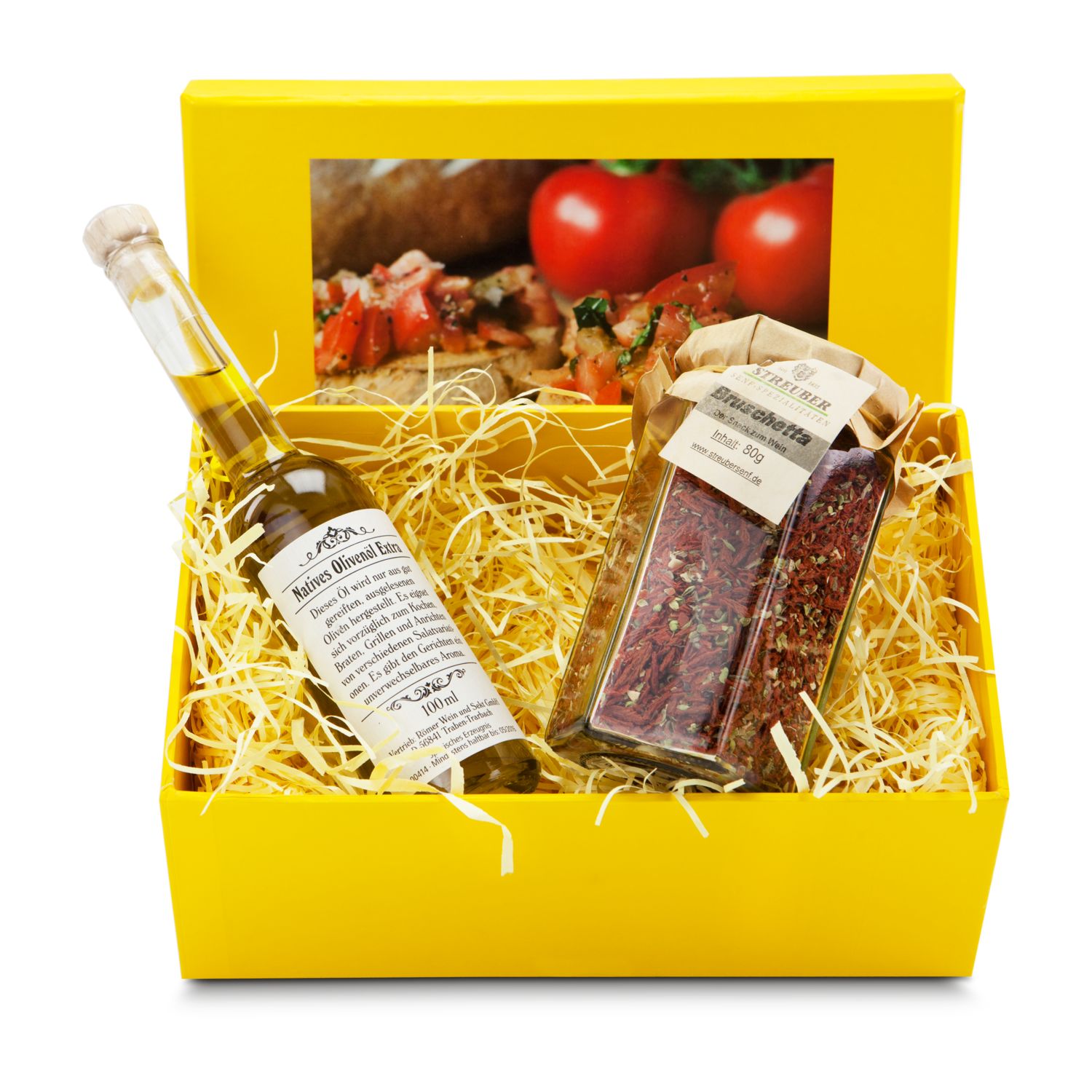 Bruschetta selbst zubereiten - kein Problem mit der Gewürzmischung (80 g) und der Flasche Natives Olivenöl Extra (100 ml). Der Deckelaufkleber auf dem farbigen Geschenkkarton macht gleich Appetit!